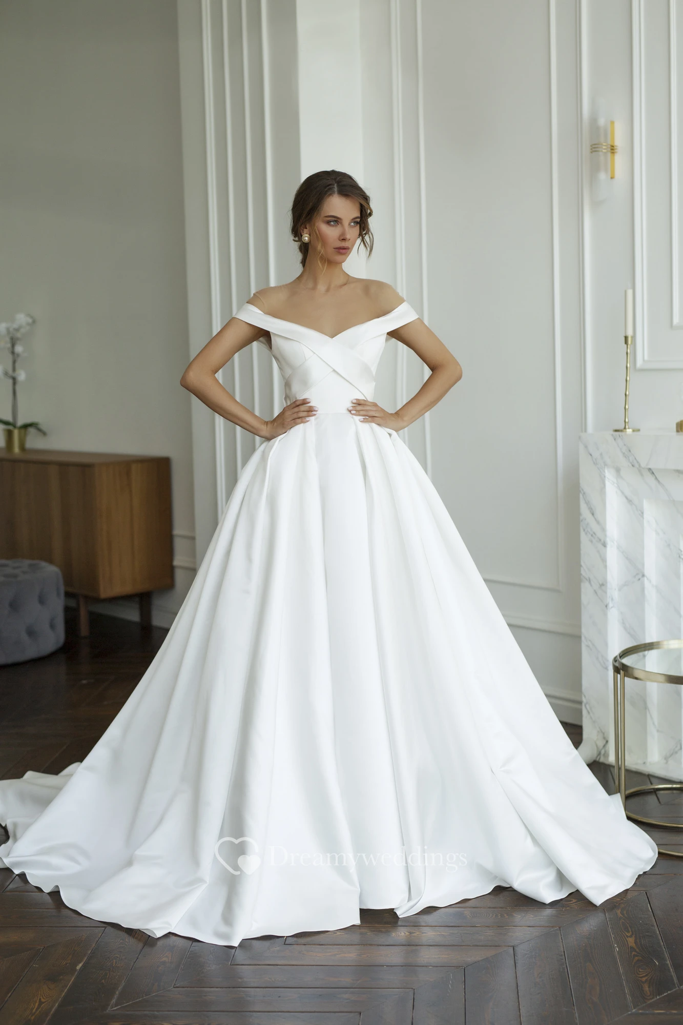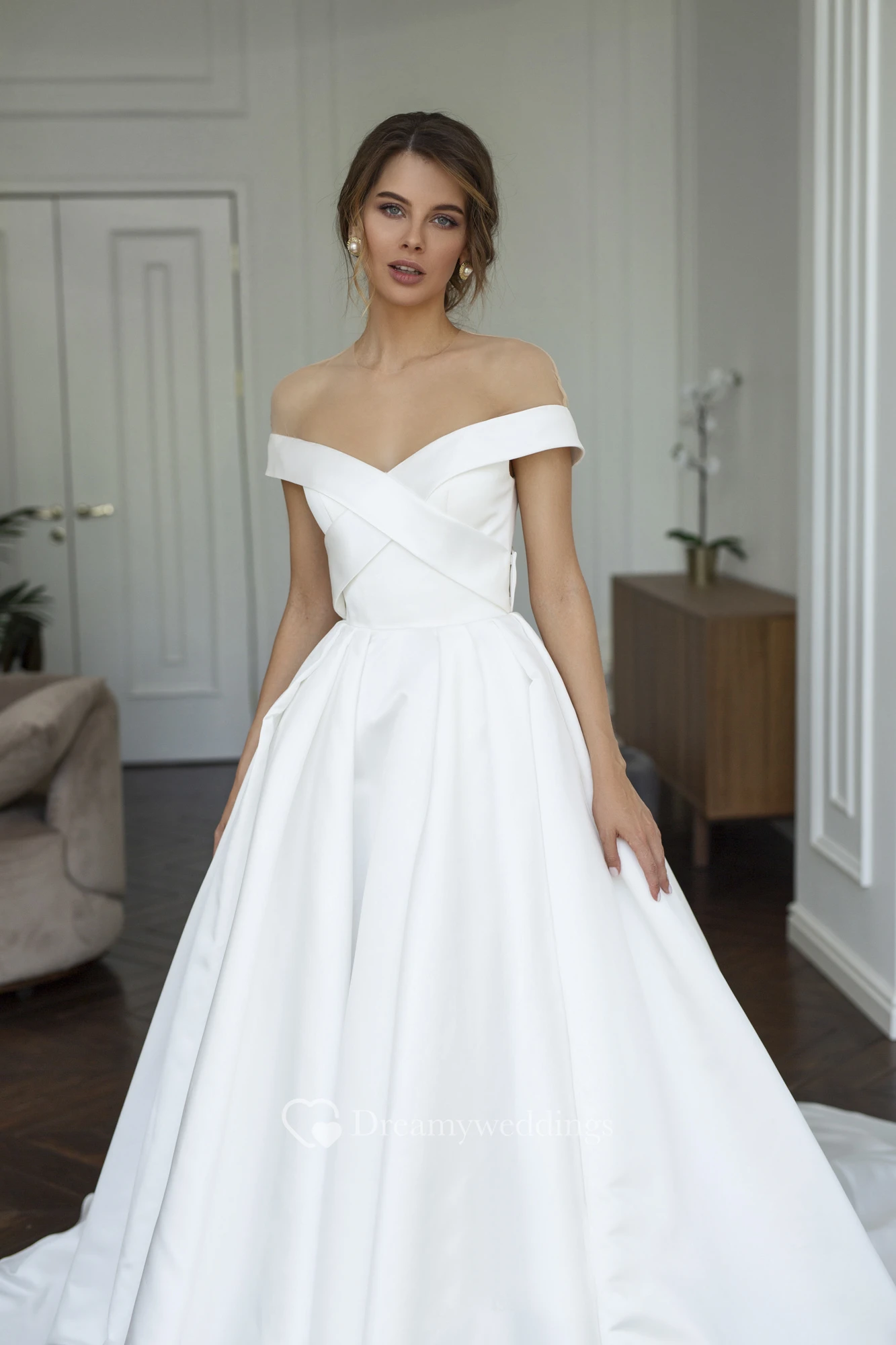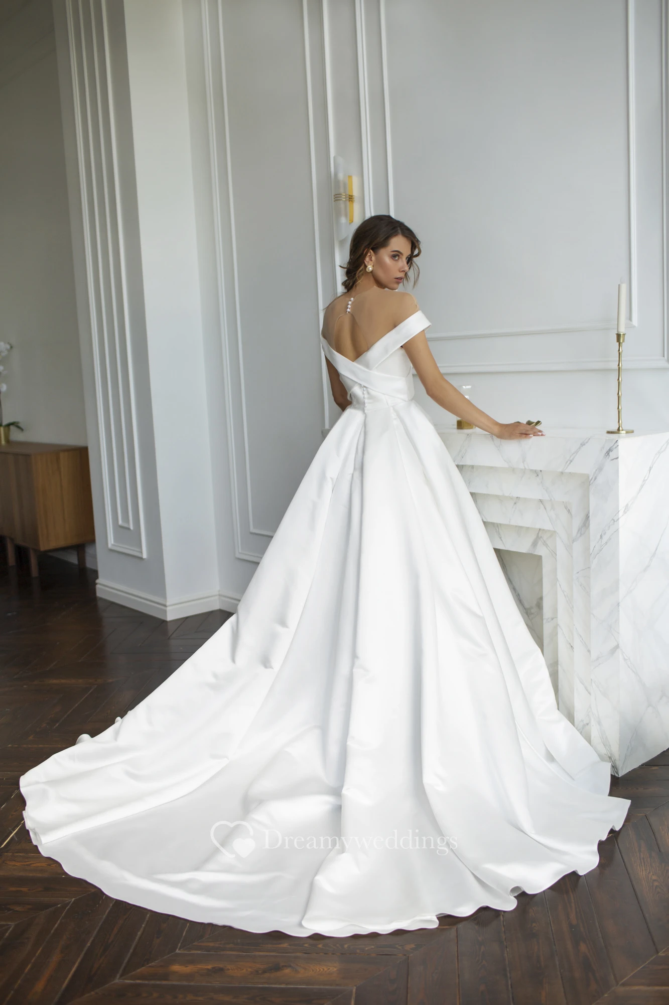 Off-the-shoulder Criss Cross Illusion Satin Wedding Dress With Illusion Keyhole Back And Buttons