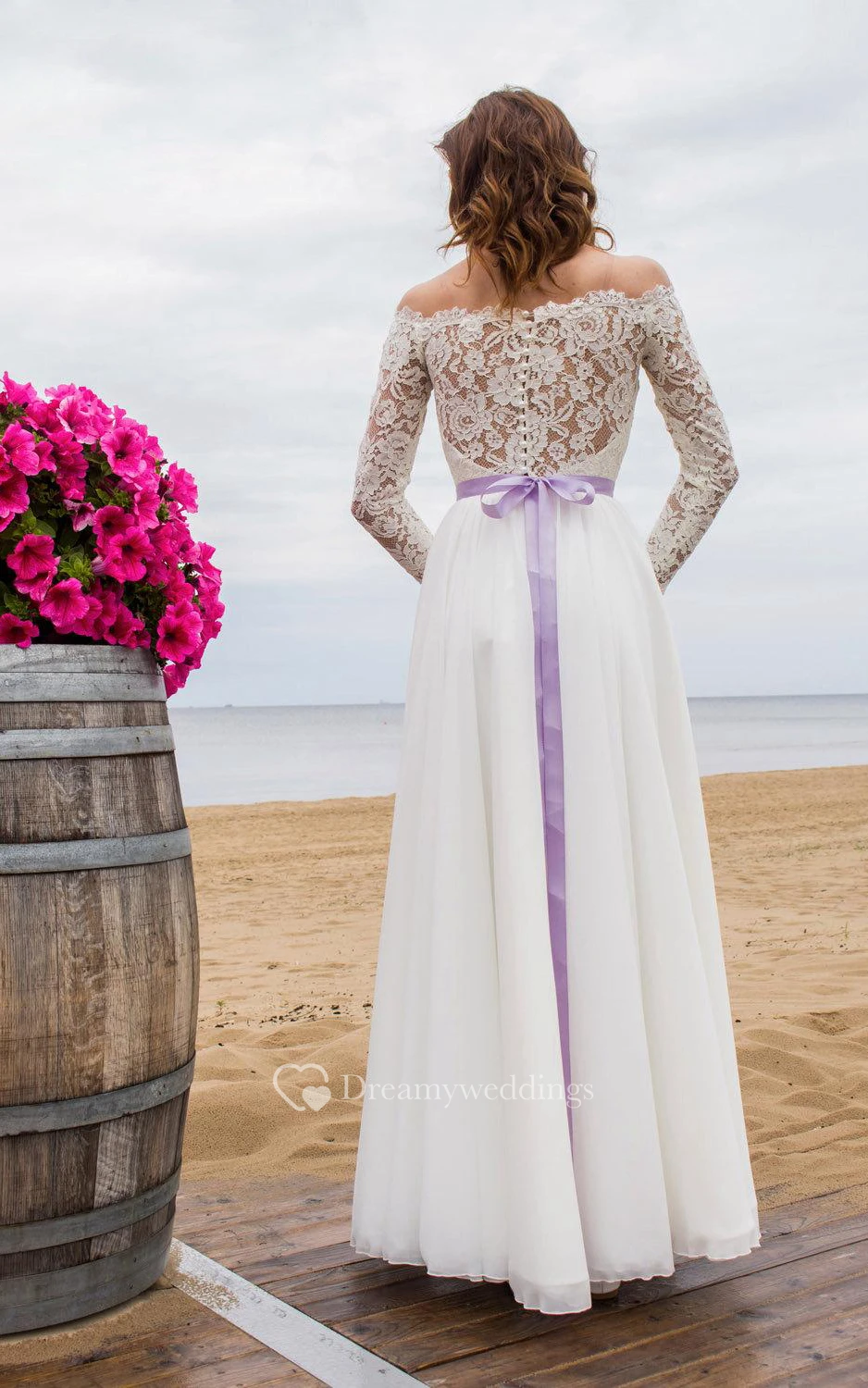 Off-The-Shoulder Long Sleeve Lace and Chiffon Dress With Bow Sash