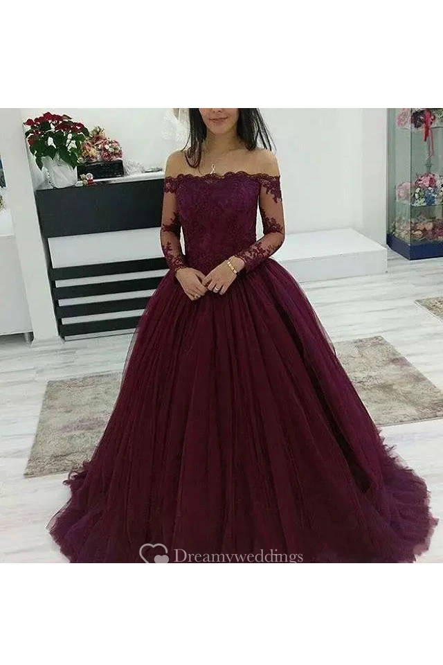 Off-the-shoulder Long Sleeve Sweep Train Tulle Ball Gown Dress