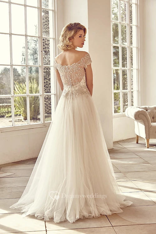 Off-The-Shoulder Maxi Short-Sleeve Beaded Tulle Wedding Dress