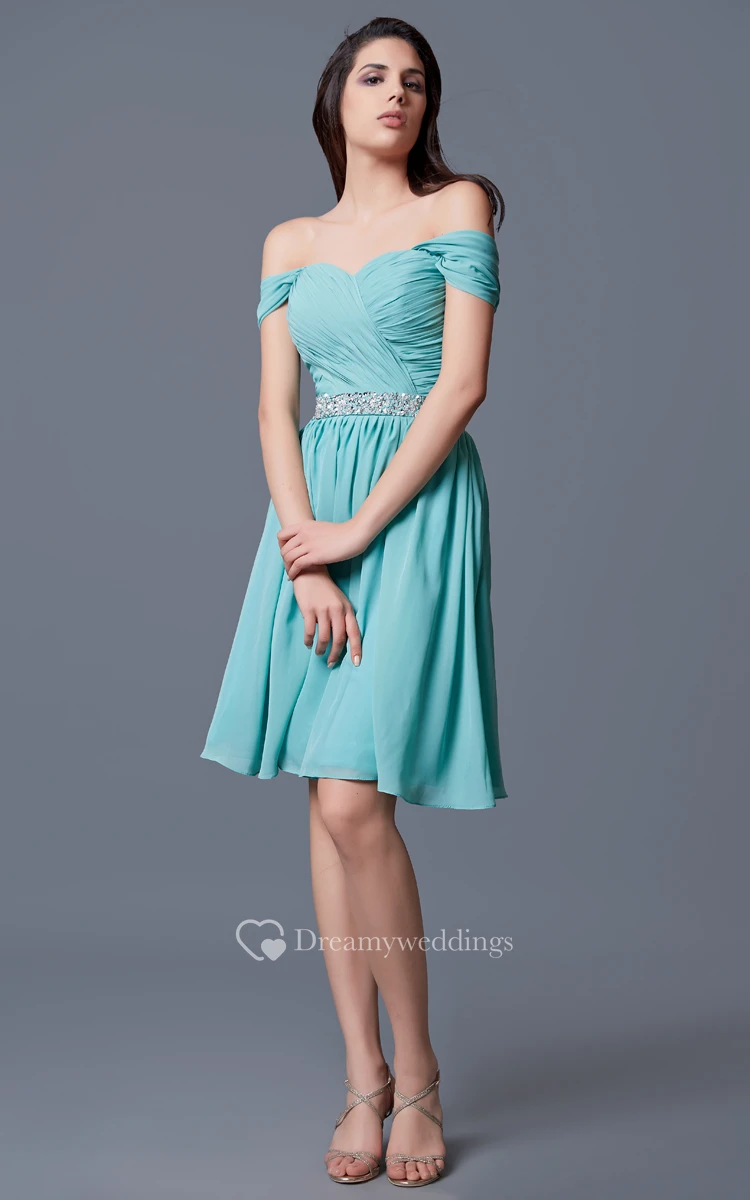 Off the Shoulder Ruched Short A-line Chiffon Dress With Beaded Waist