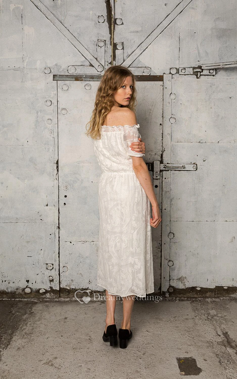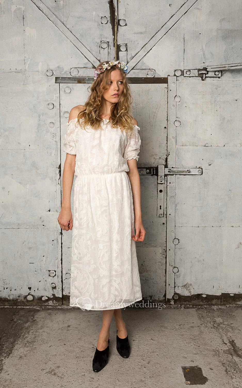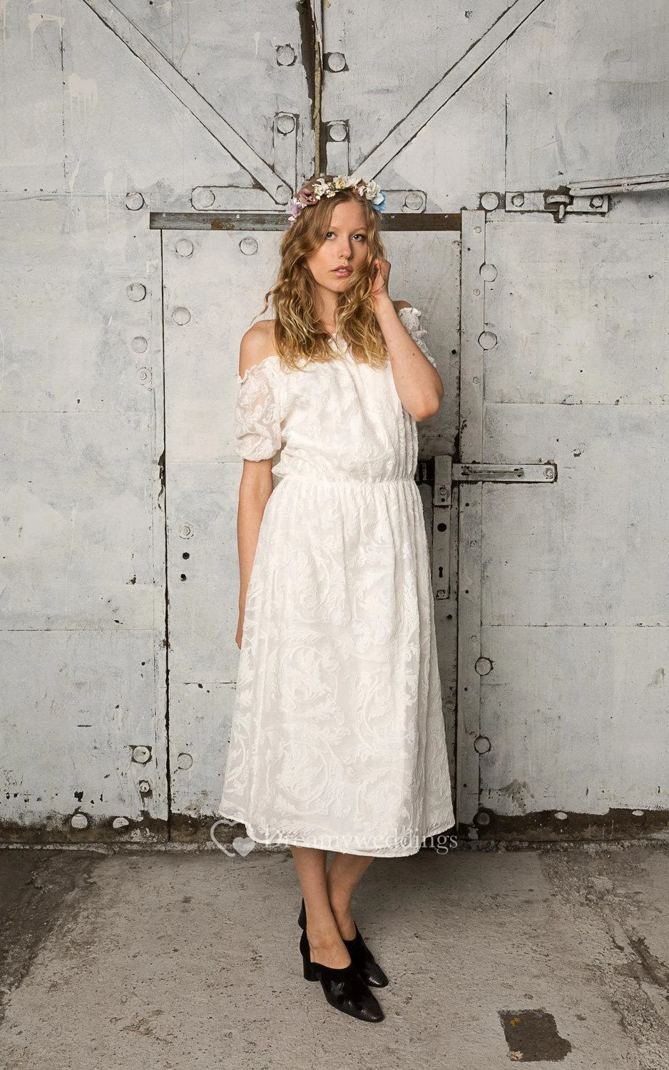 Off-The-Shoulder Short Sleeve A-Line Lace Tea Length Dress