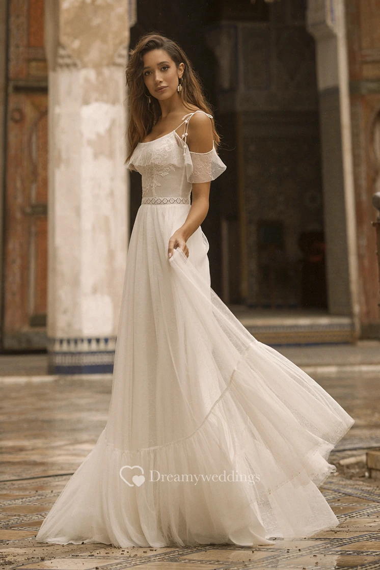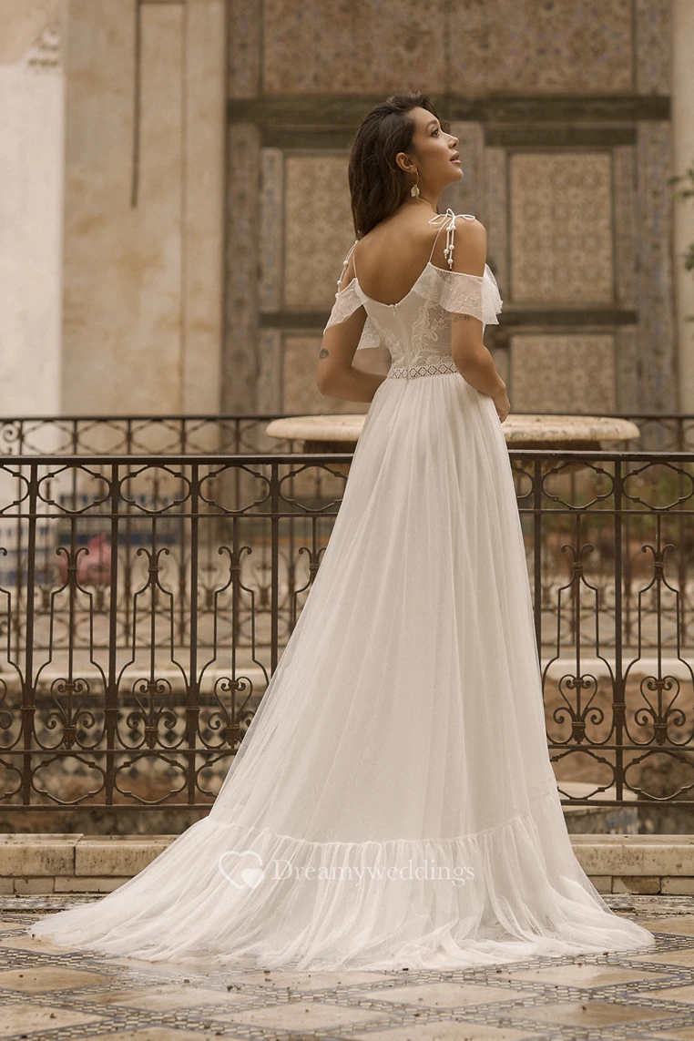 Off-the-shoulder Spaghetti Straps Adorable Tulle Wedding Dress With Lace Details