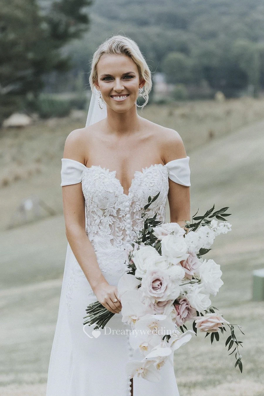 Off-the-shoulder Split Front Sexy Sweetheart Satin Wedding Dress With Lace And Button Details