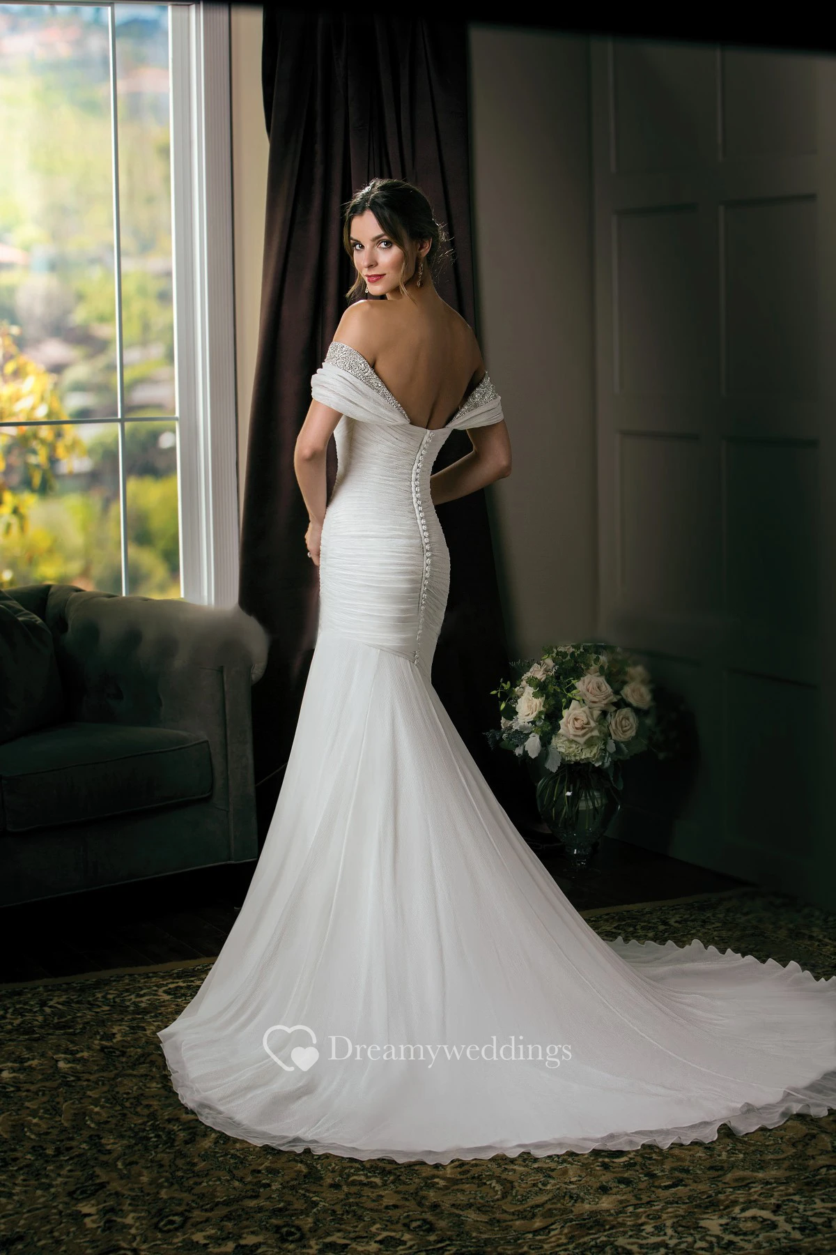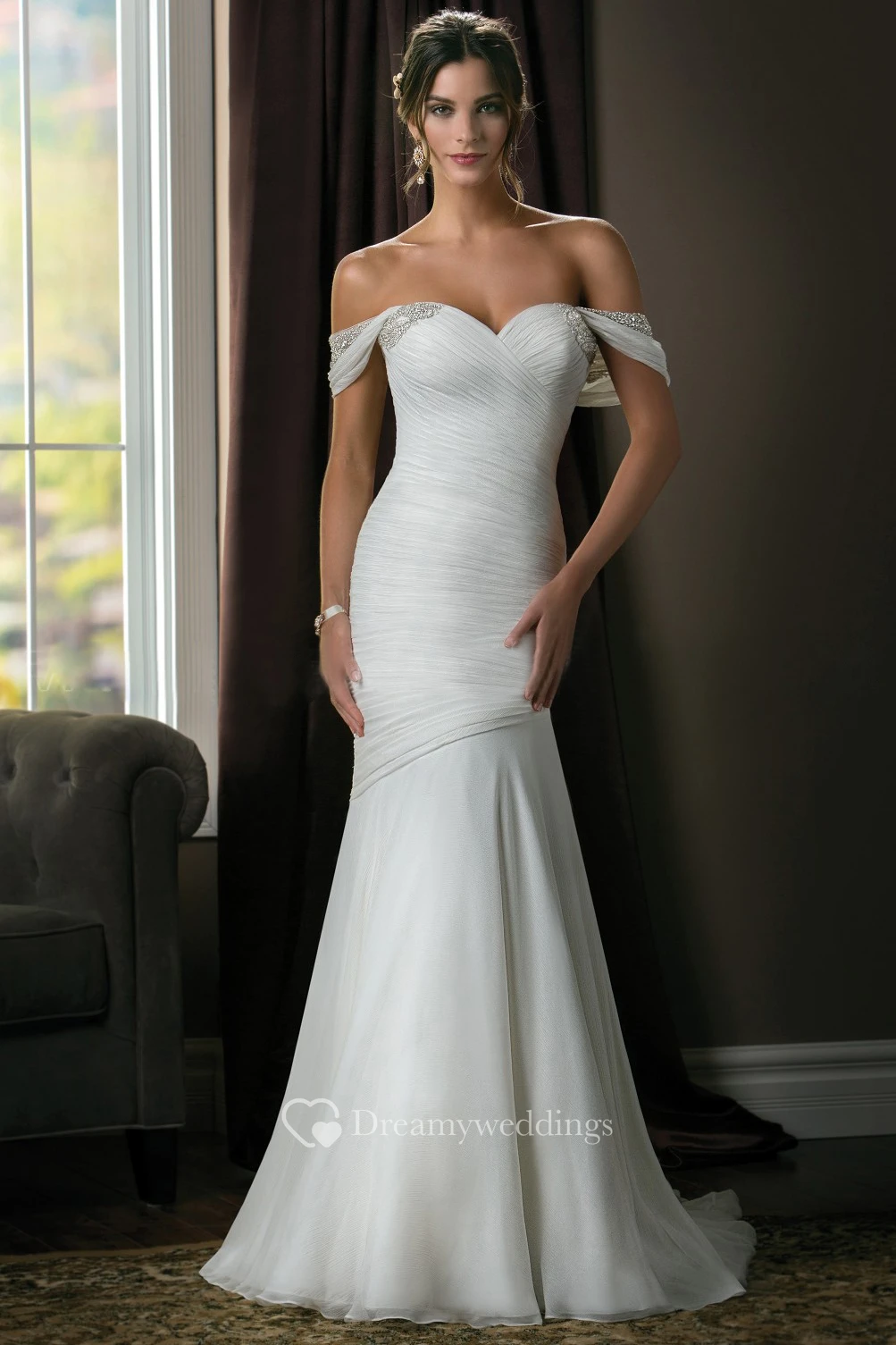 Off-The-Shoulder Trumpet Wedding Dress With Ruches And Crystals