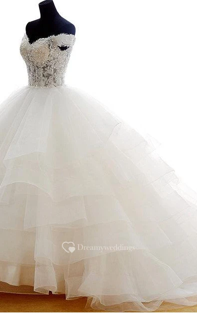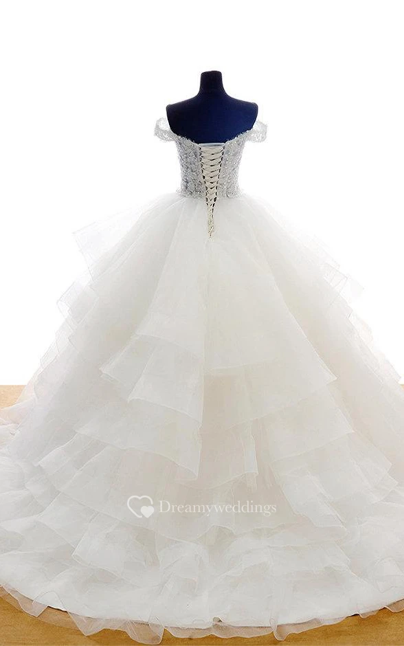 Off-The-Shoulder Tulle Ball Gown With Layered Skirt and Beaded Bodice