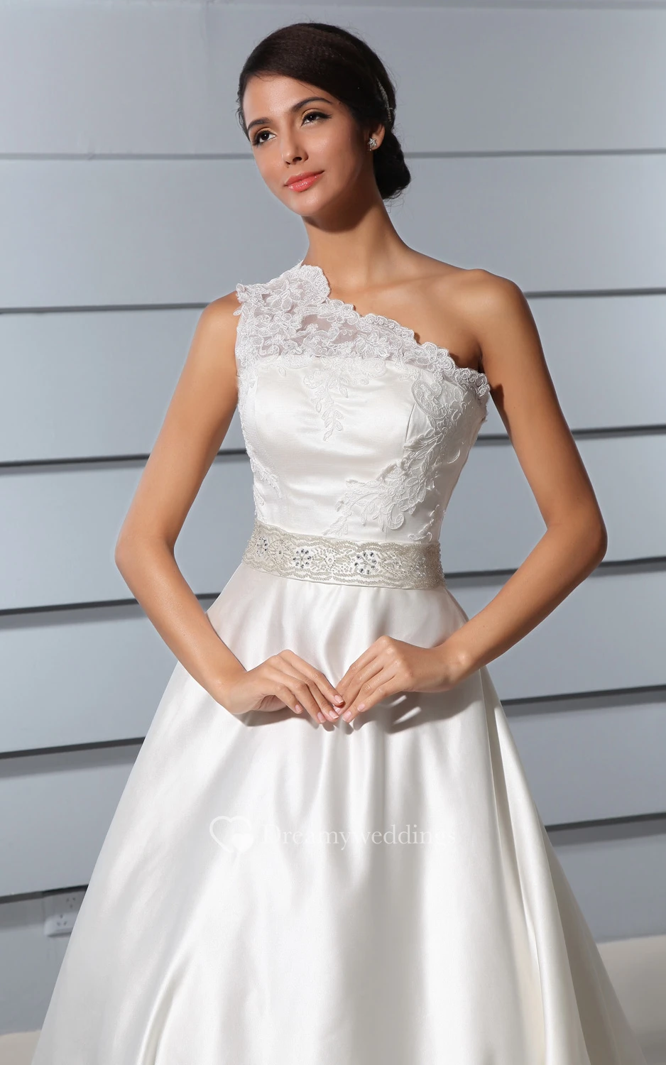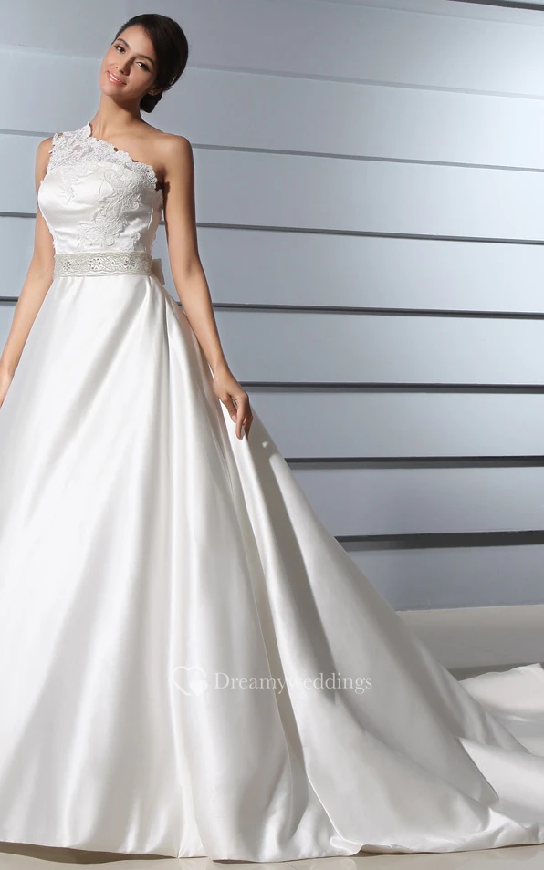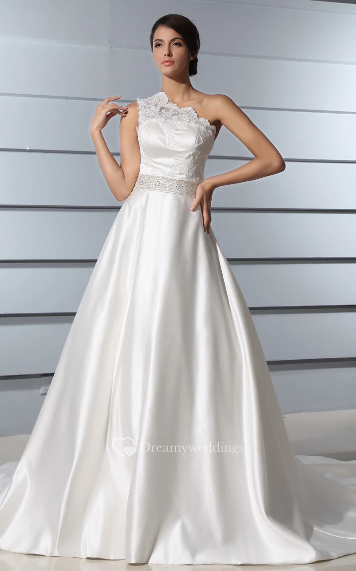 One-Shoulder A-Line Satin Dress With Lace Bodice and Chapel Train