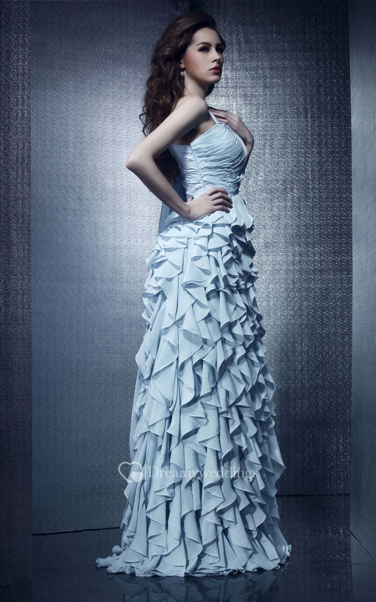 One-Shoulder Chiffon Maxi Dress With Ruching and Cascading Ruffles