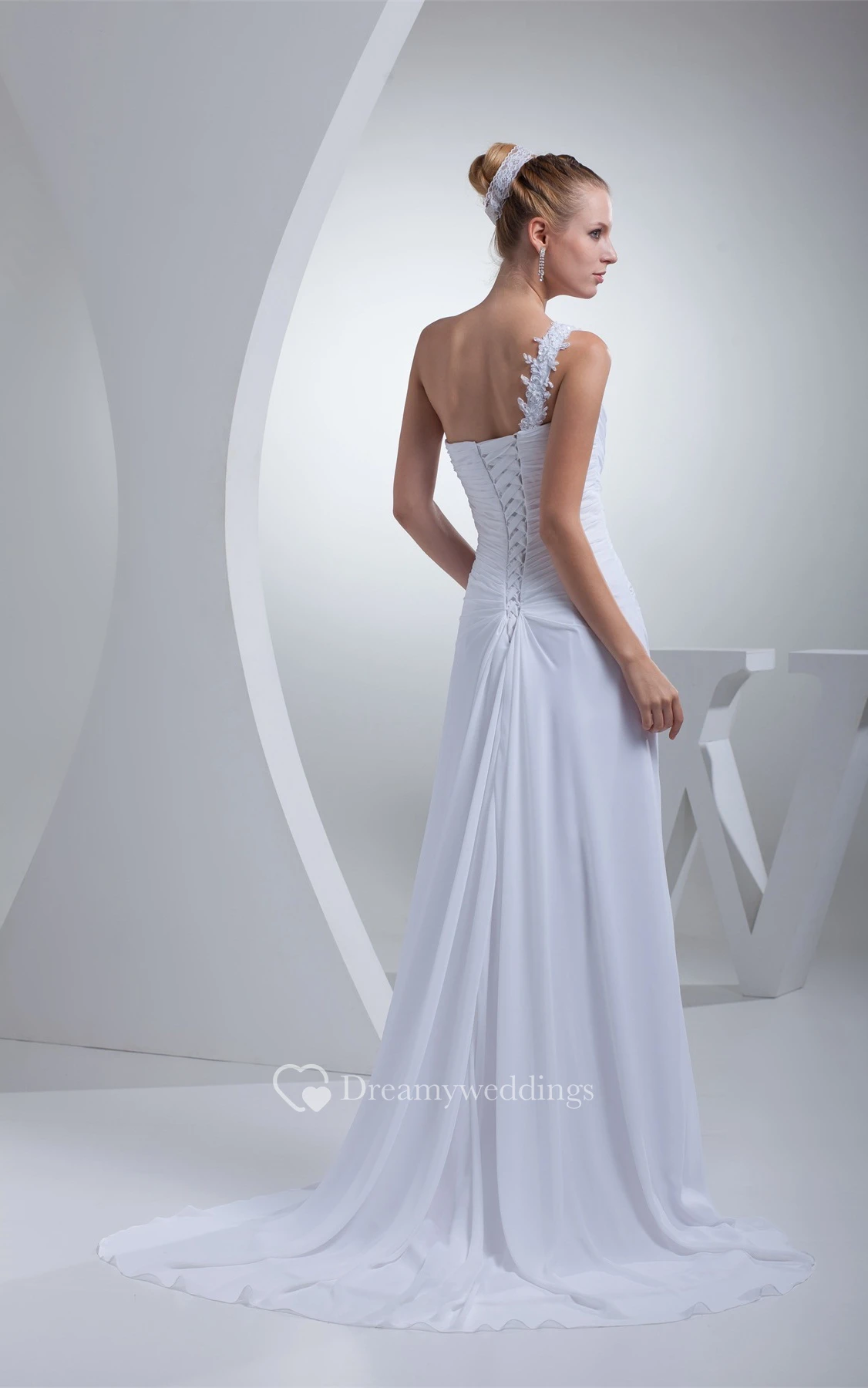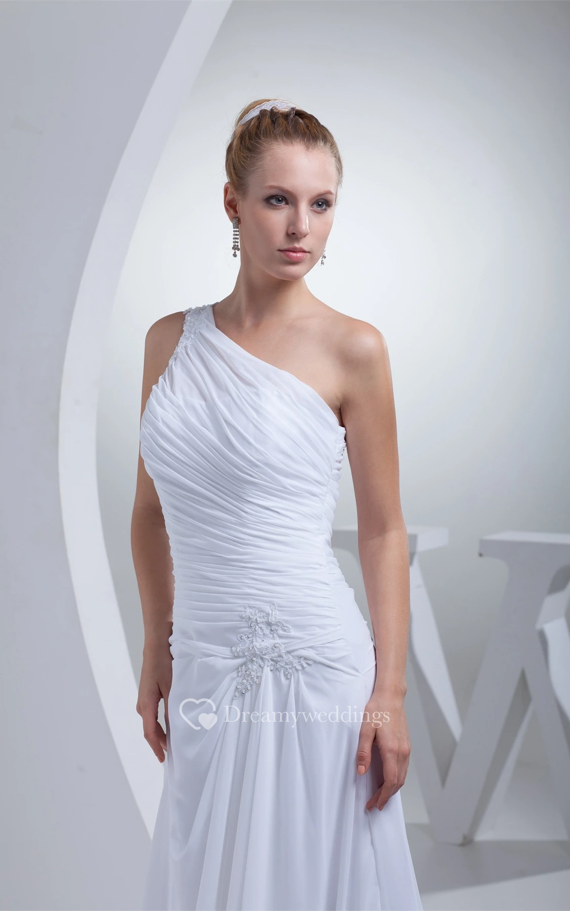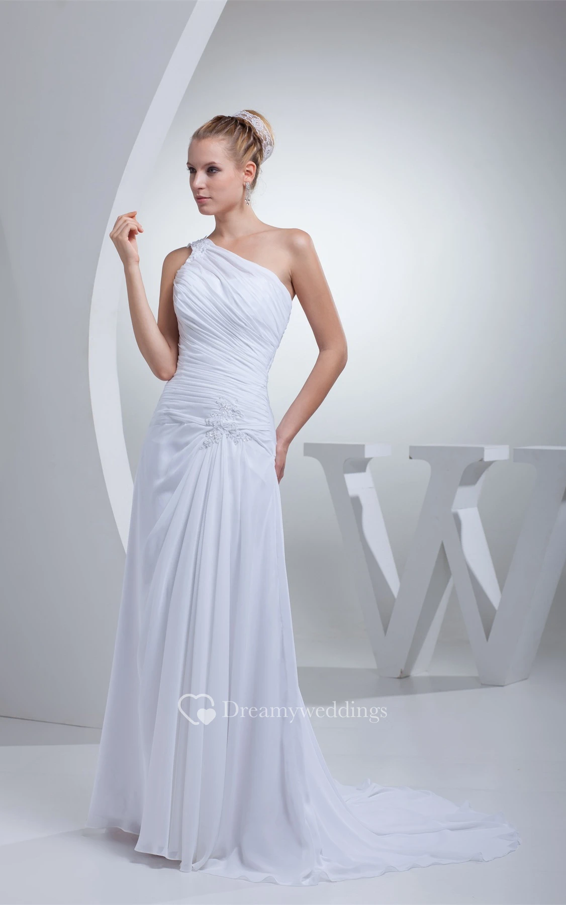 One-Shoulder Floor-Length Ruched Sweep Train and Dress With Appliques