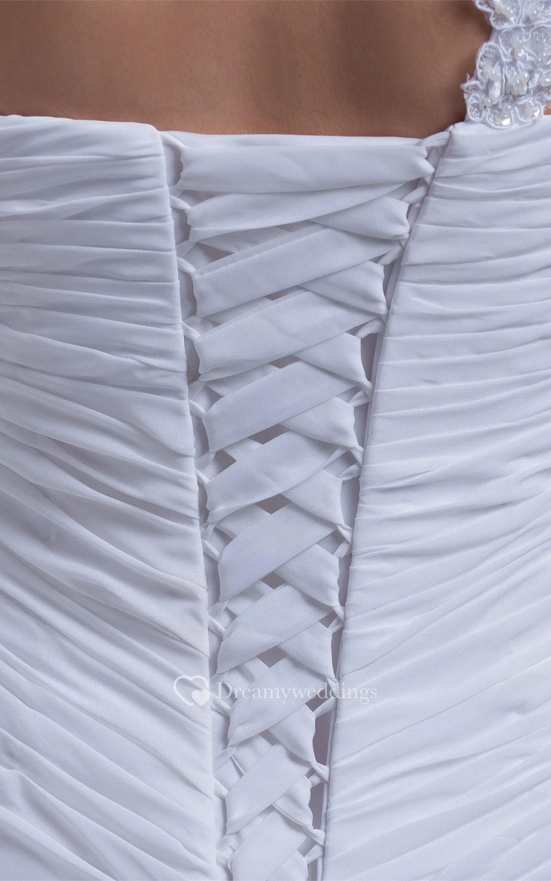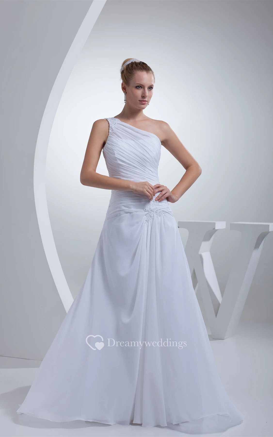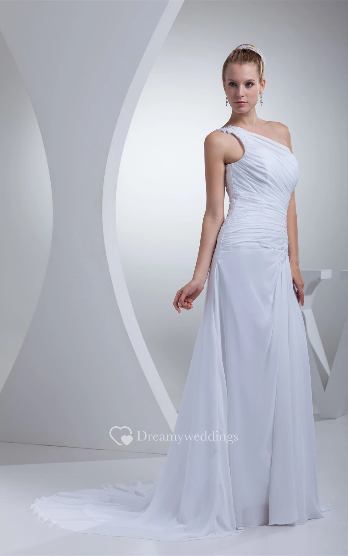 One-Shoulder Floor-Length Ruched Sweep Train and Dress With Appliques