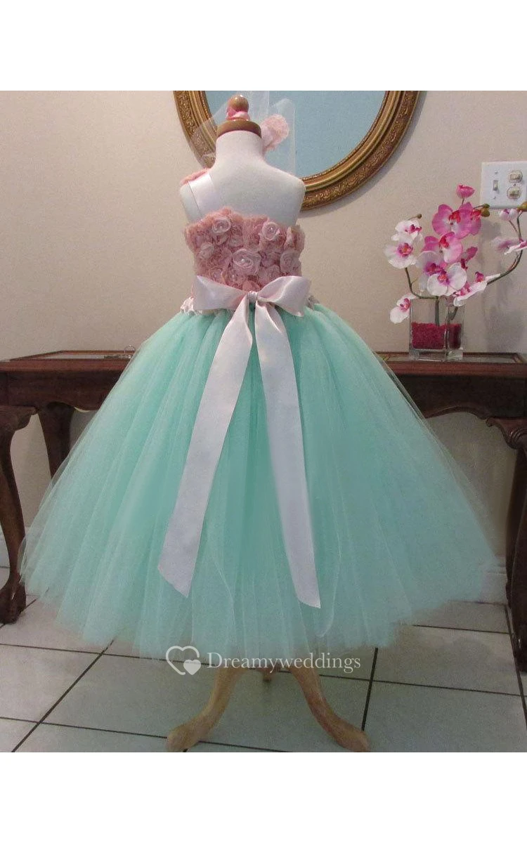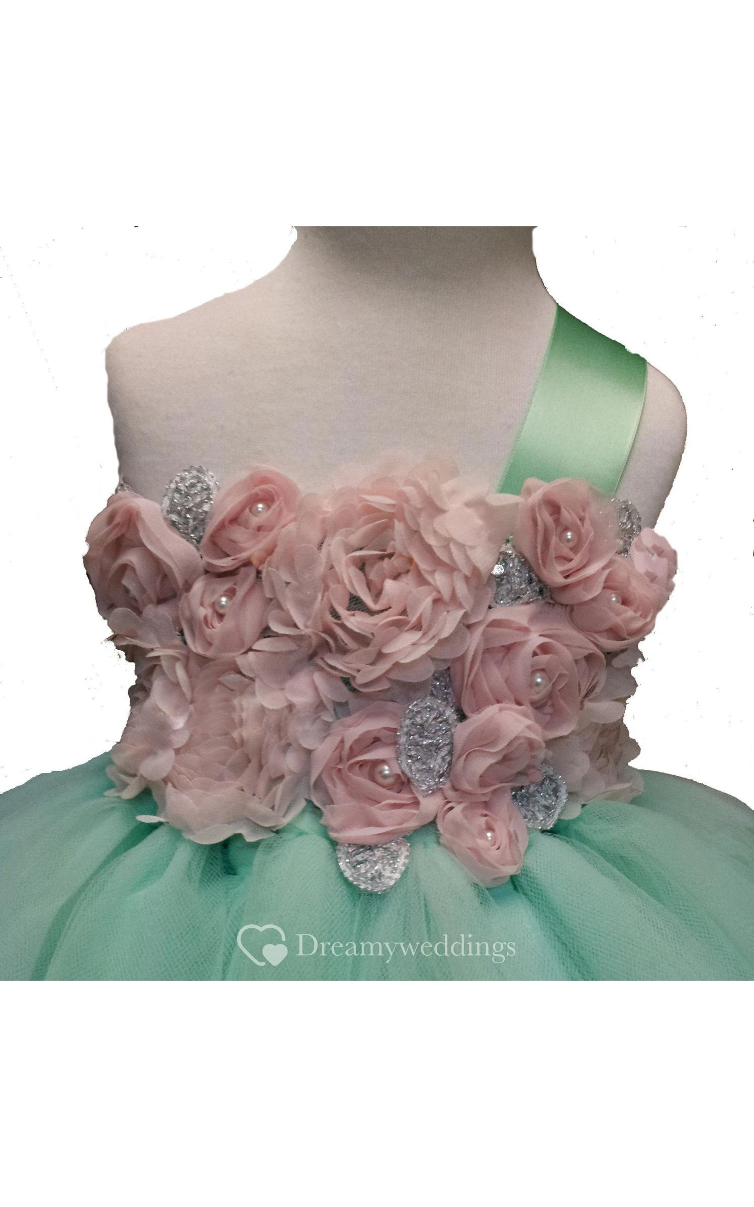 One Shoulder Flower Bodice Tulle Ball Gown With Bow Sash