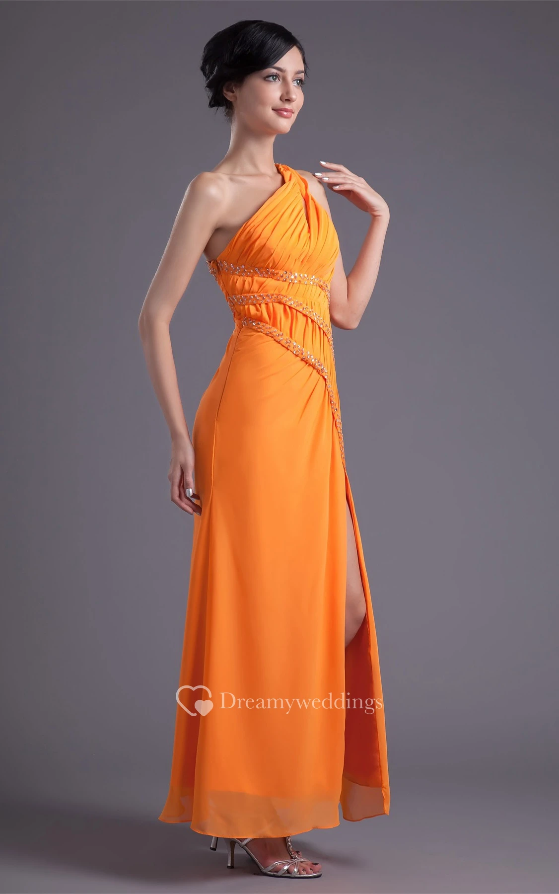 One-Shoulder Front-Split Chiffon Dress With Jewels