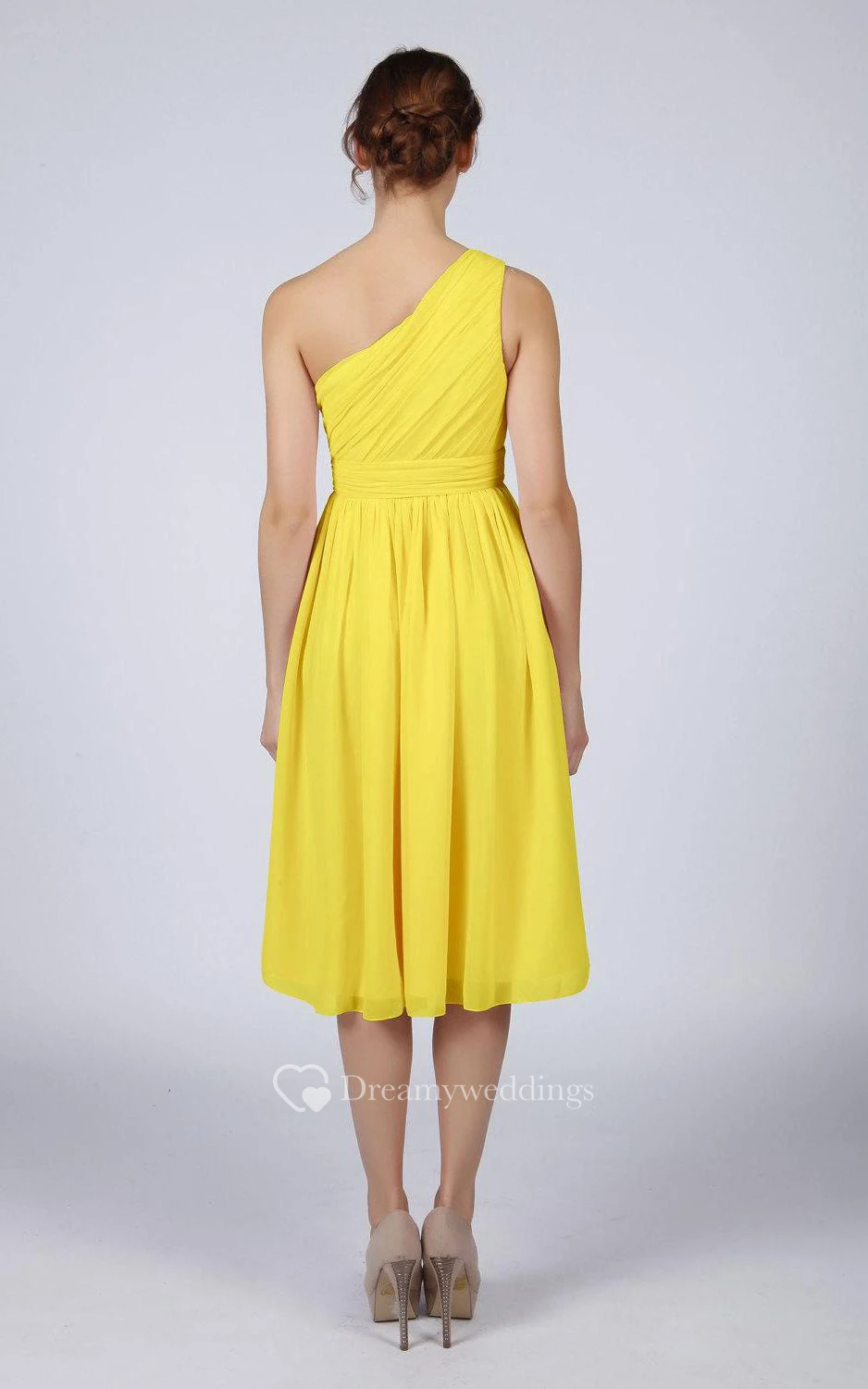 One Shoulder Pleated A-line Chiffon Tea Length Dress Yellow