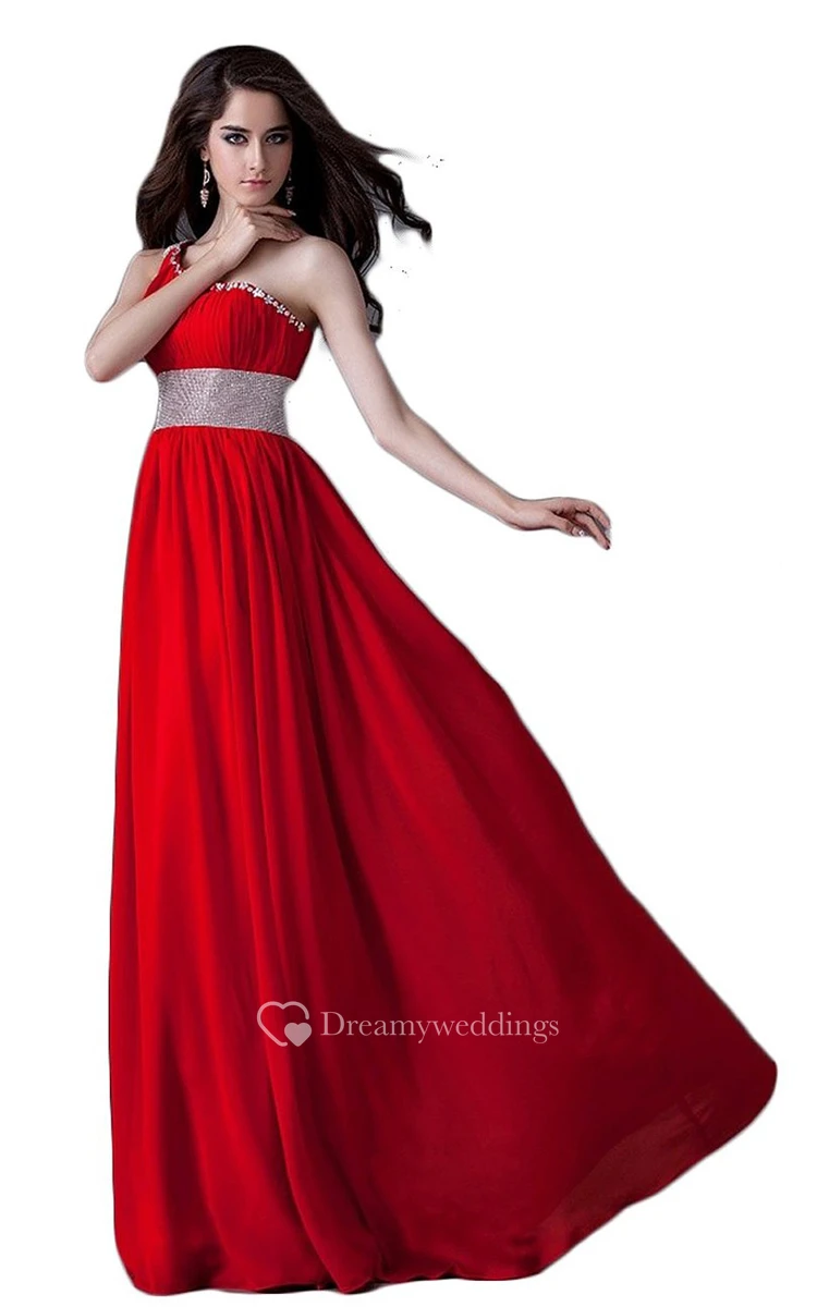 One-shoulder Pleated Chiffon A-line Gown With Beaded Band