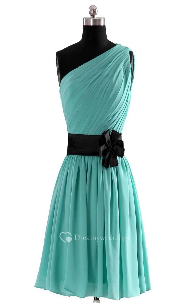 One-shoulder Pleated Chiffon Short Dress With Floral Band