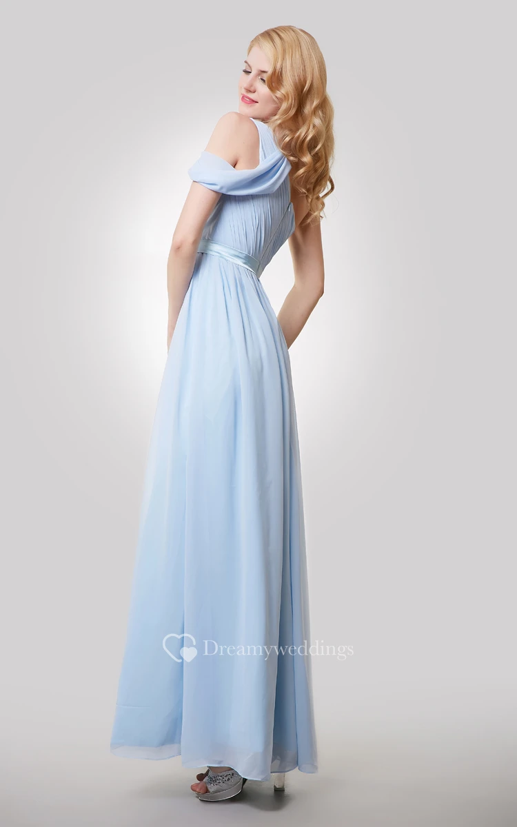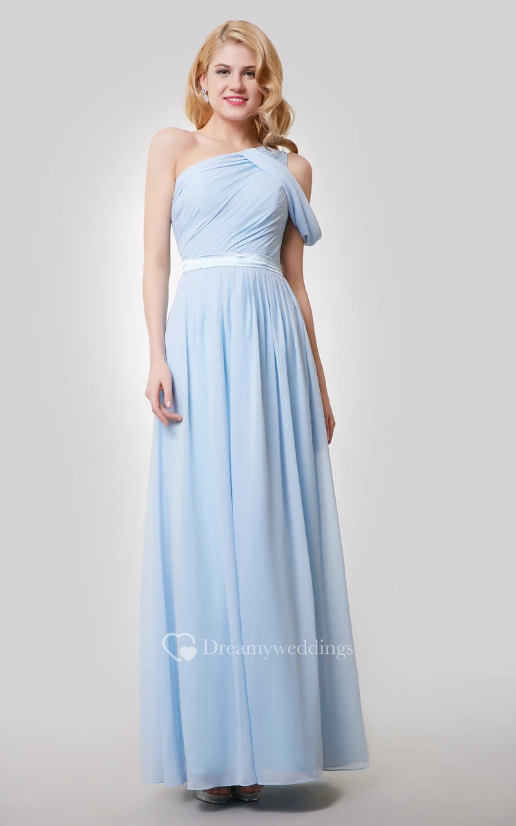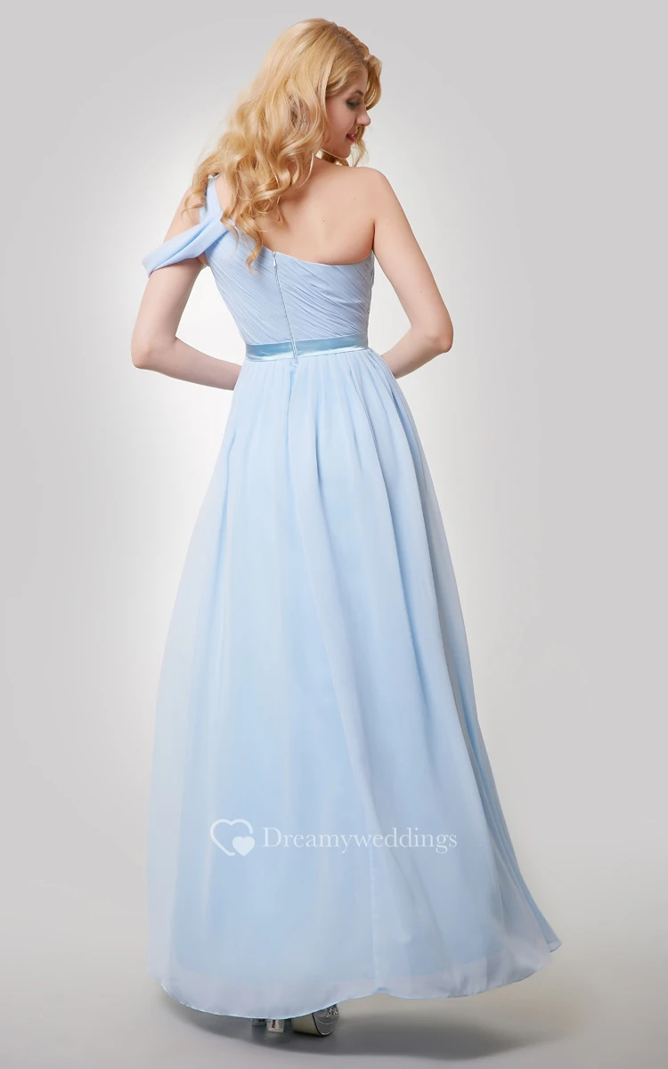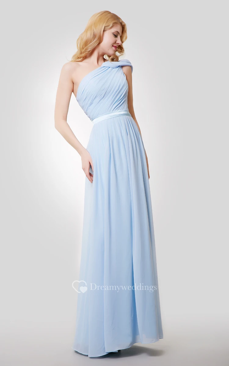 One-Shoulder Ruched Floor Length A-Line Chiffon Dress With Satin Sash