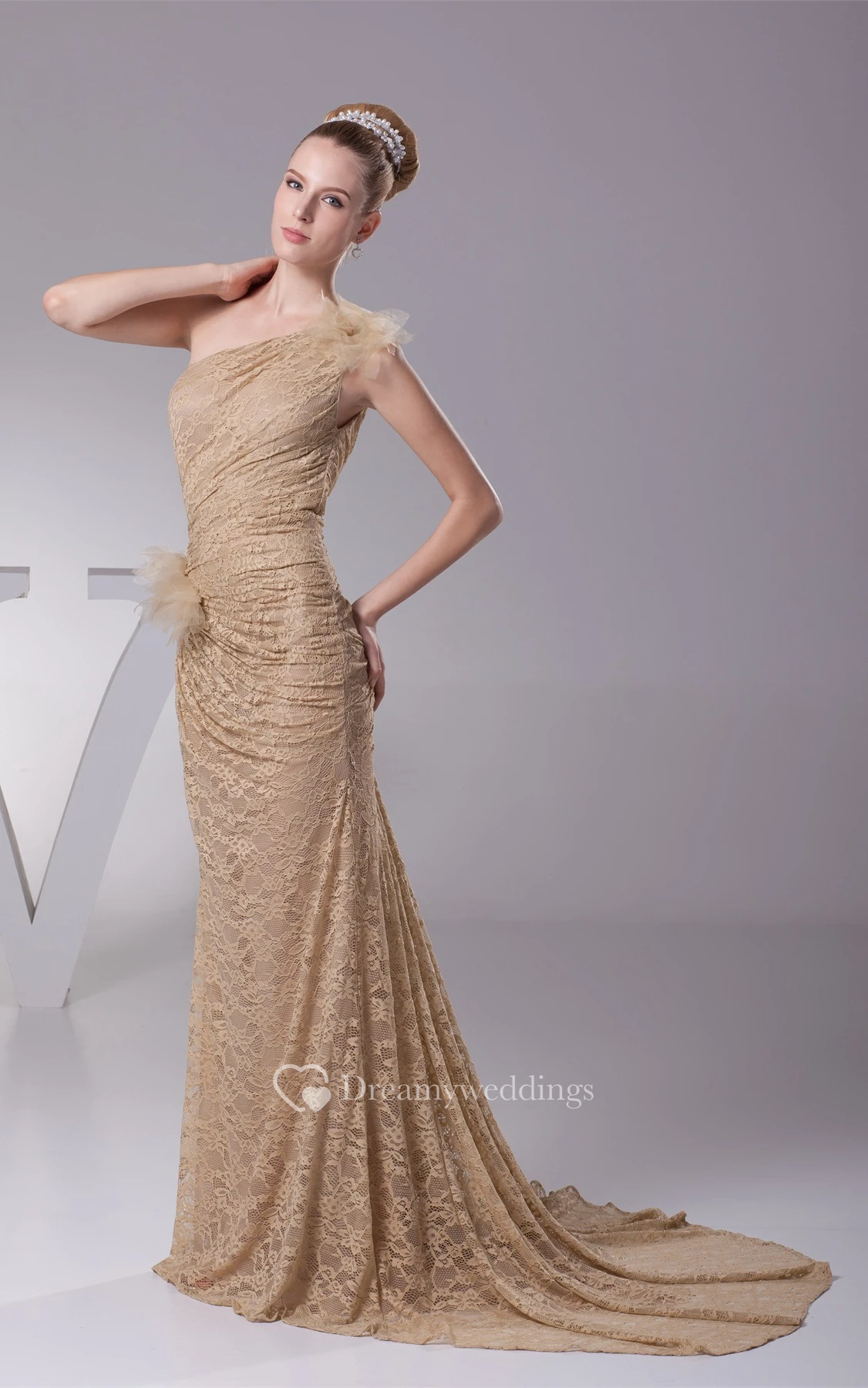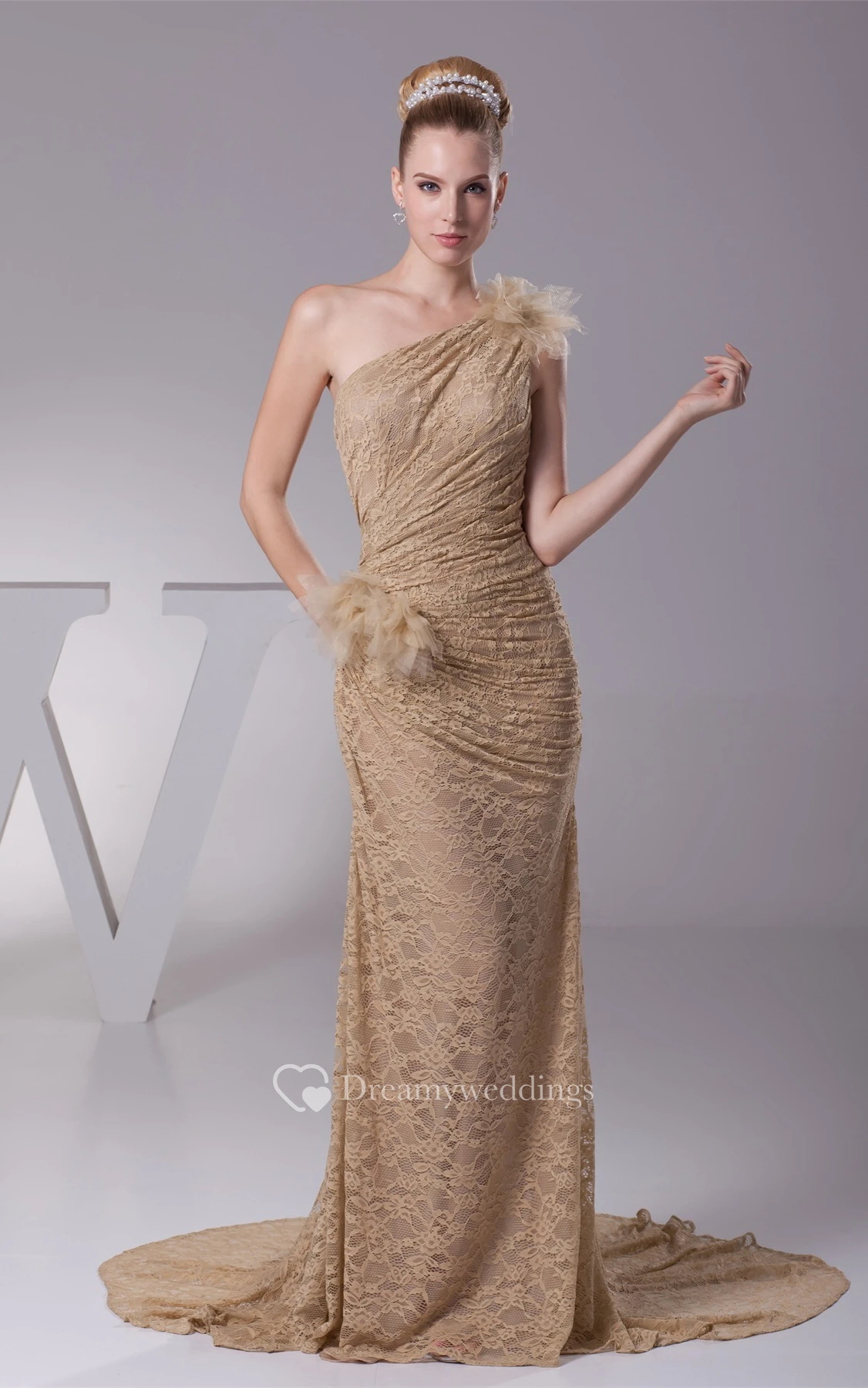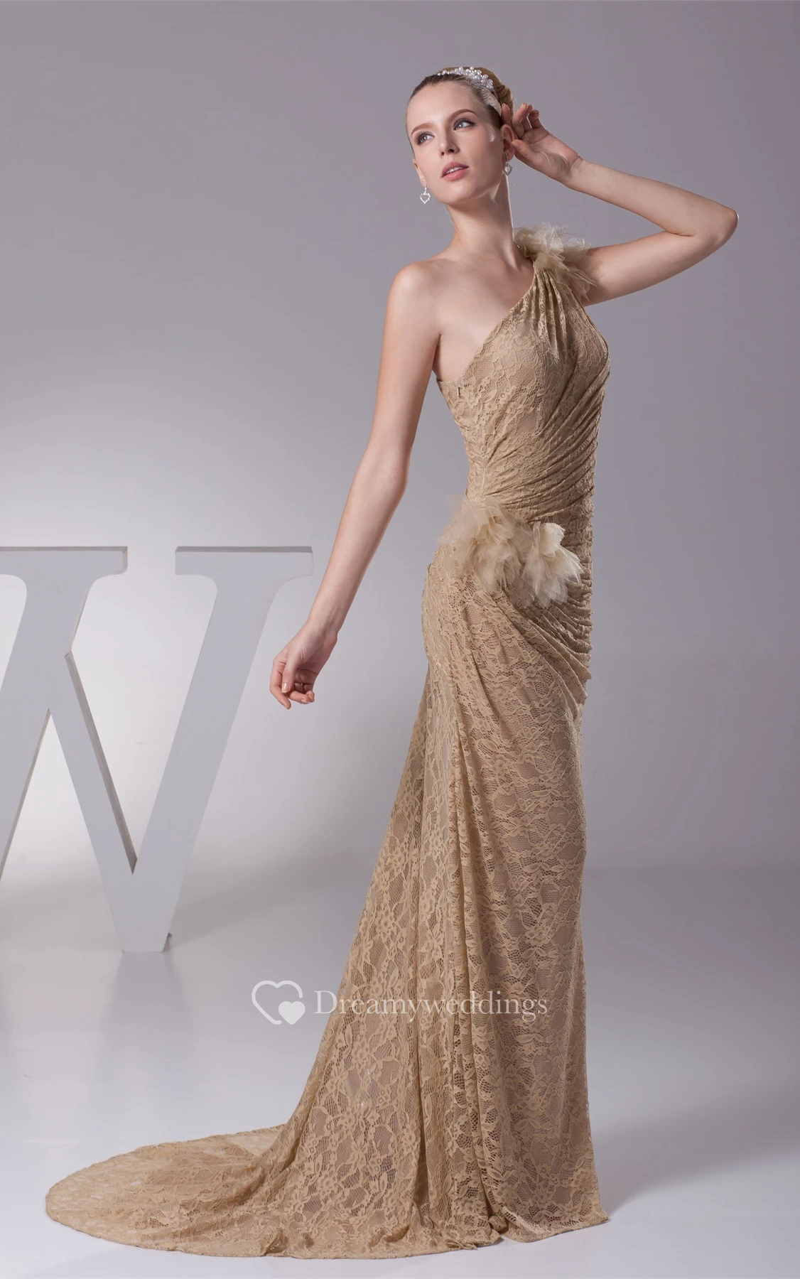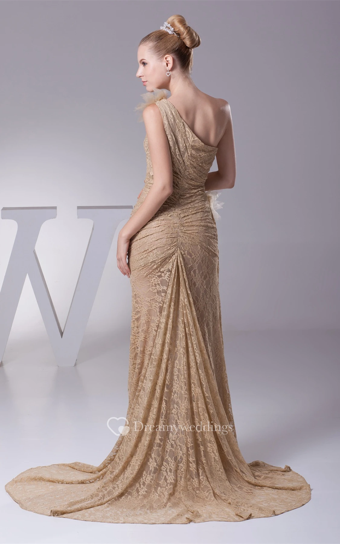 One-Shoulder Sheath Lace Side Ruching and Dress With Flower