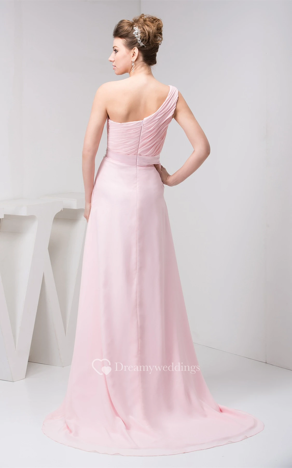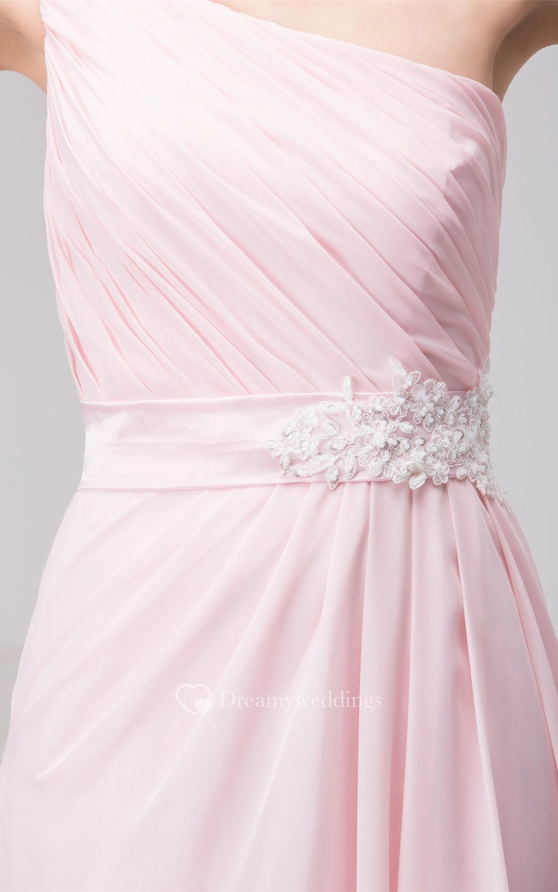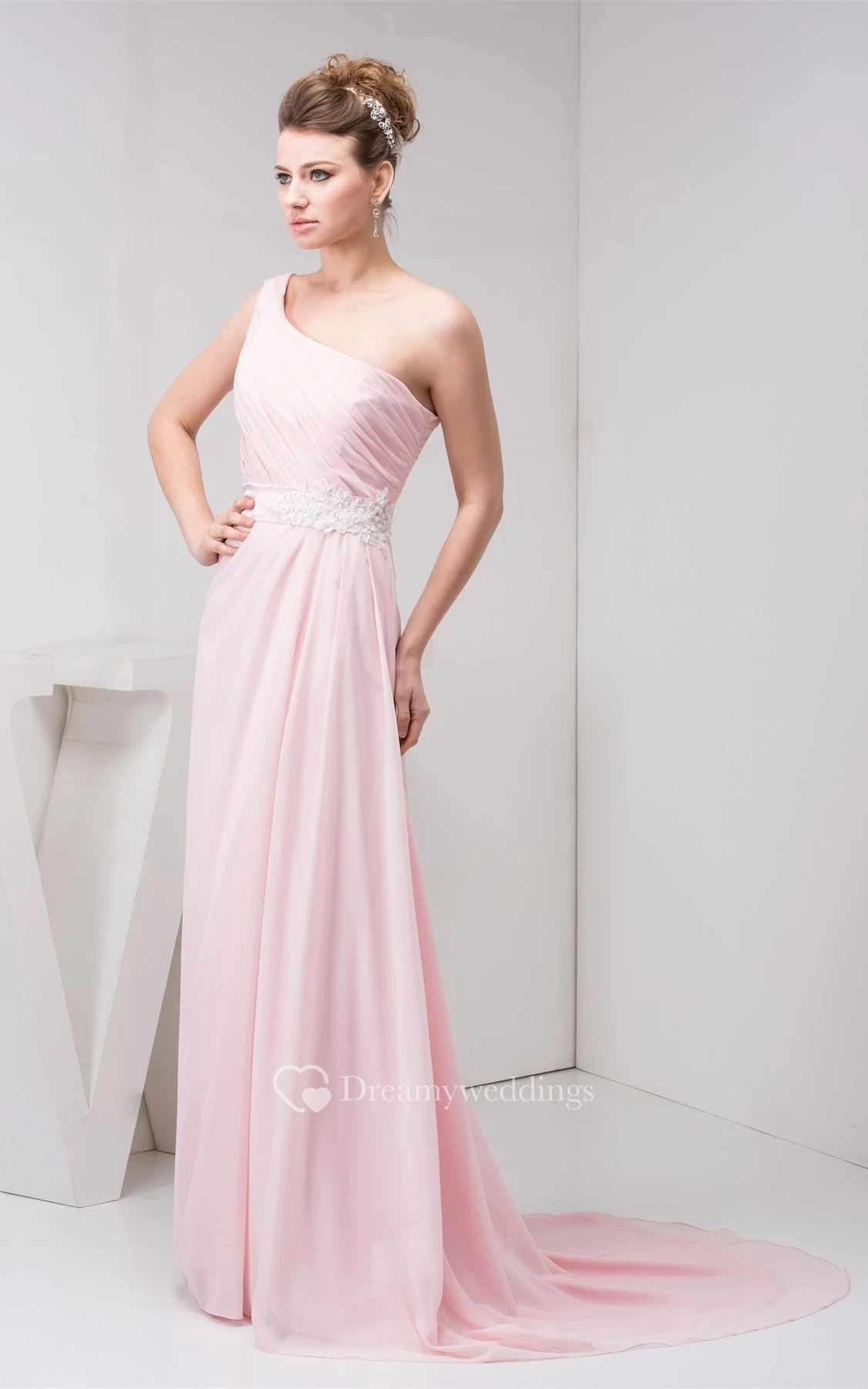 Pastel Chiffon One-Shoulder Appliques and Gown With Ruching