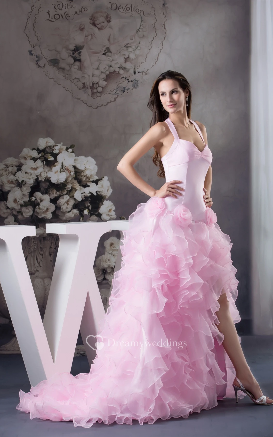 Pastel Ruffled Front-Split Halter and Dress With Flower