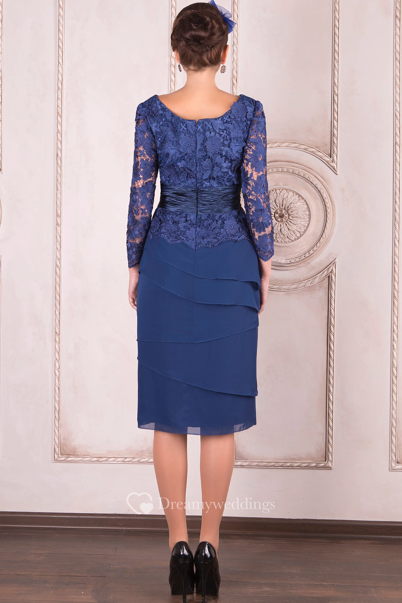 Pencil Knee-Length Appliqued Long Sleeve Scoop Neck Lace Mother Of The Bride Dress