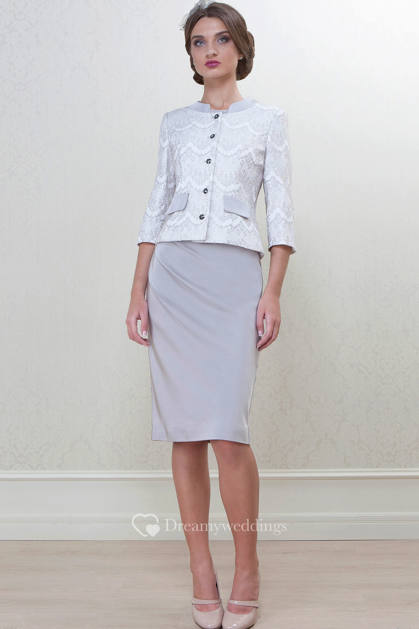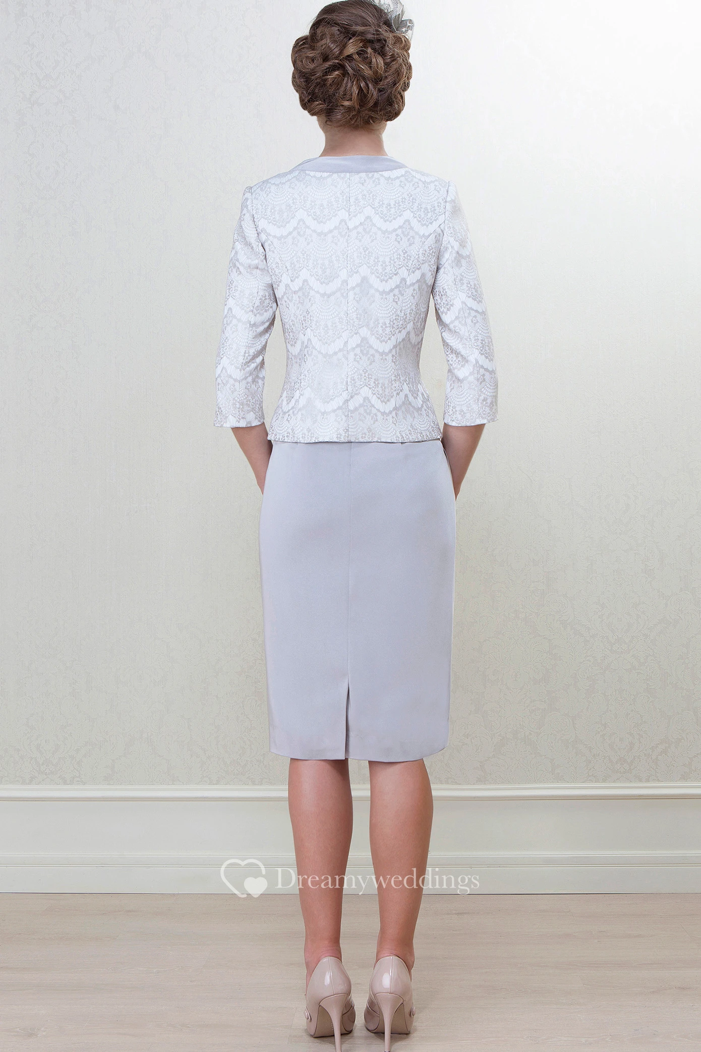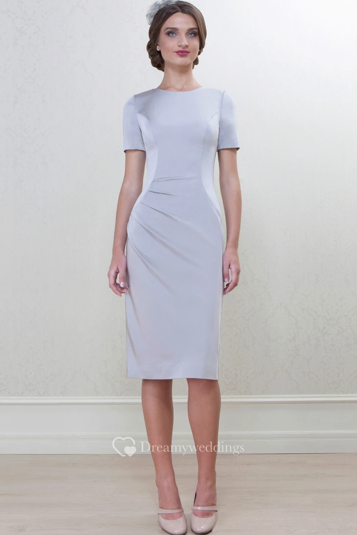 Pencil Knee-Length High Neck Caped 3-4 Sleeve Satin Mother Of The Bride Dress