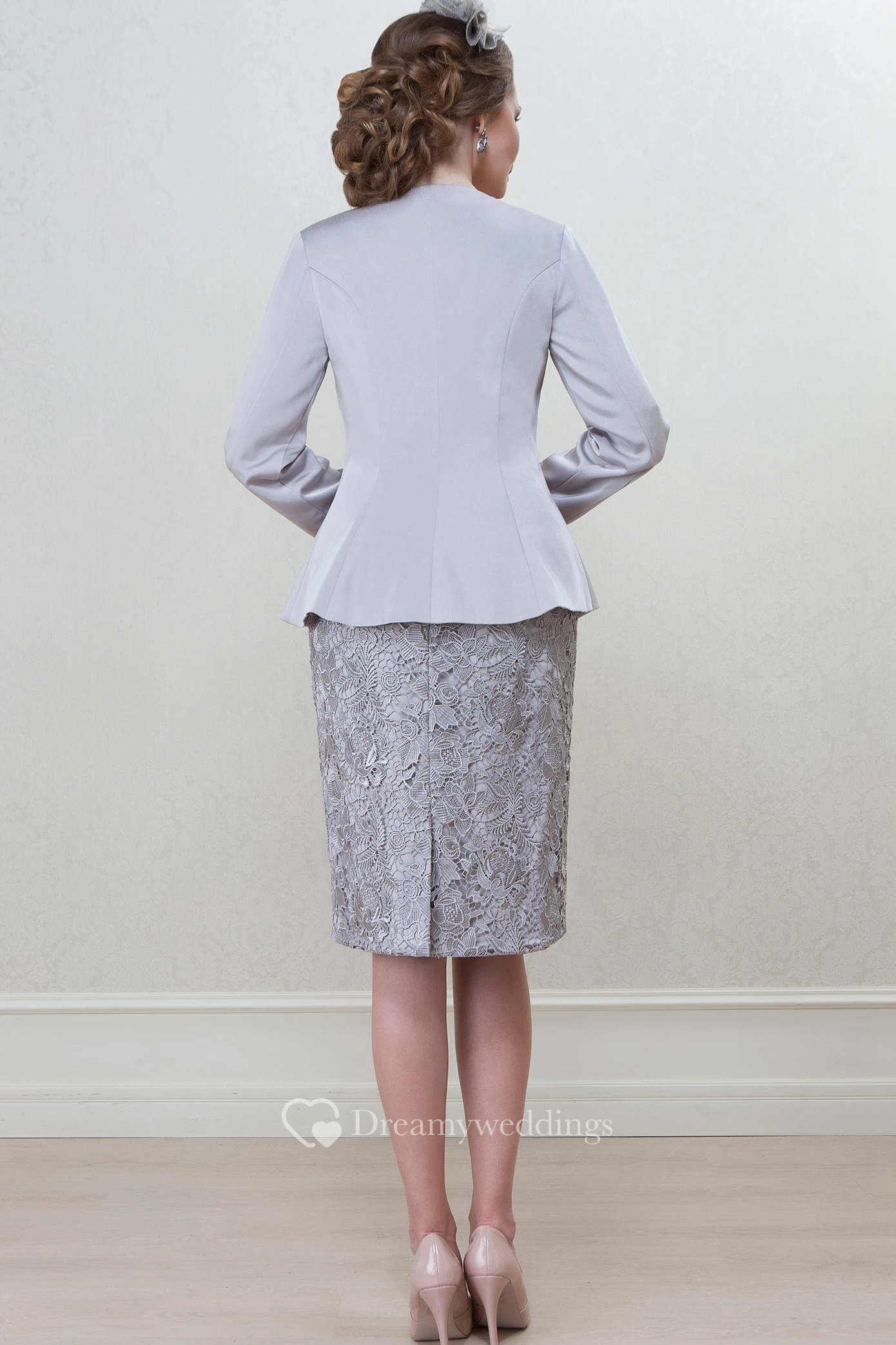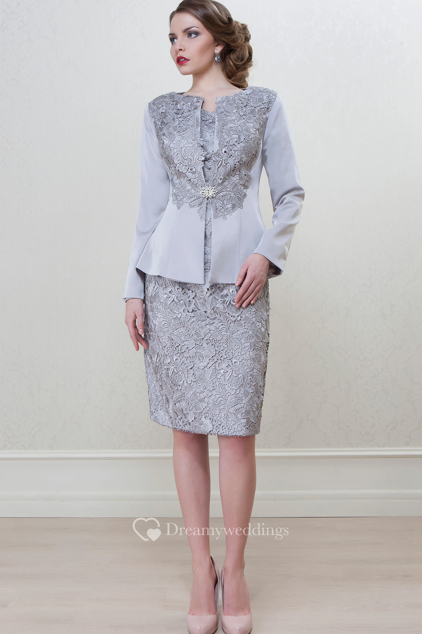 Pencil Knee-Length Long Sleeve Bateau Neck Appliqued Satin Mother Of The Bride Dress