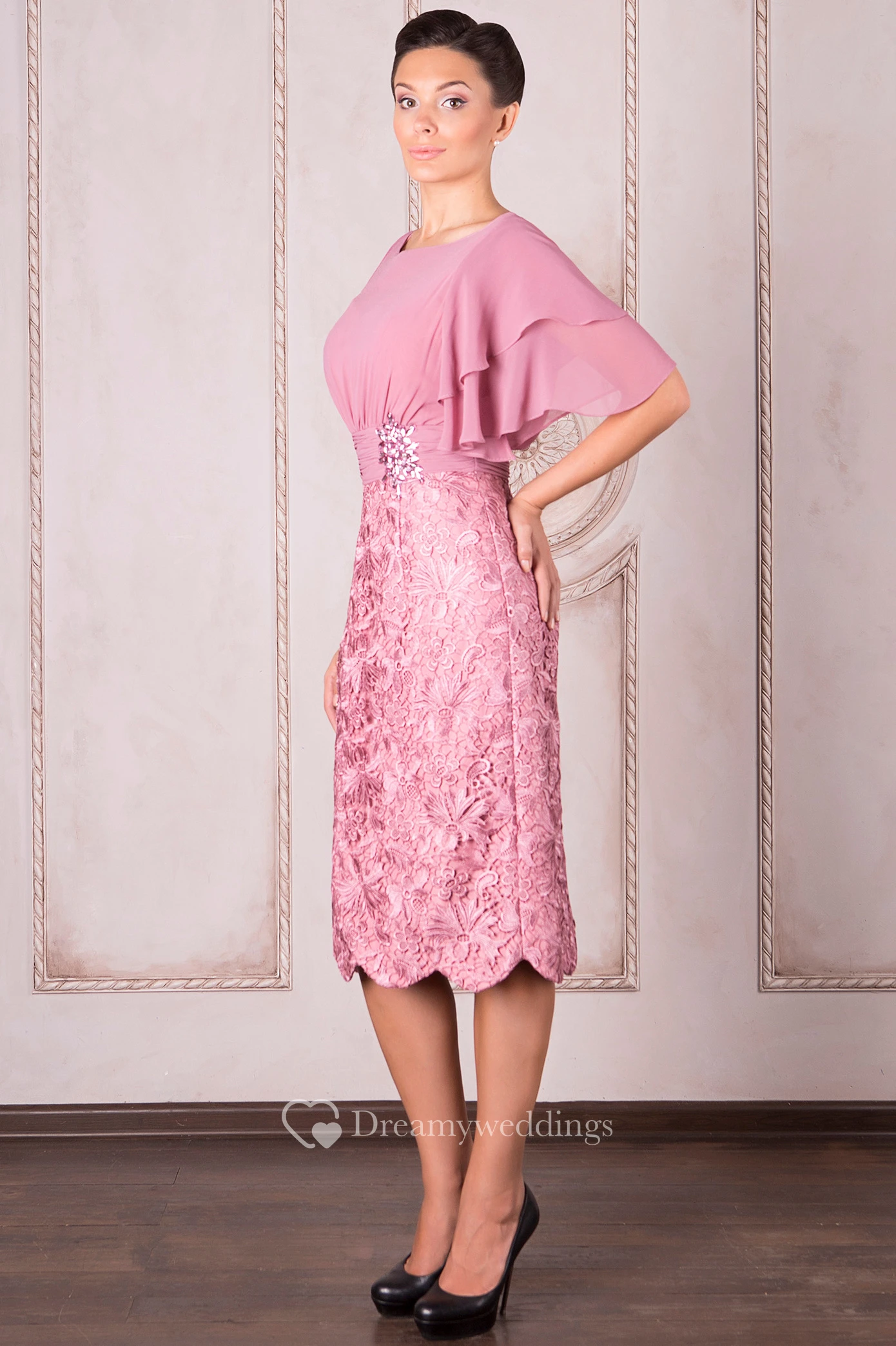 Pencil Knee-Length Poet Sleeve Bateau Neck Appliqued Chiffon Mother Of The Bride Dress