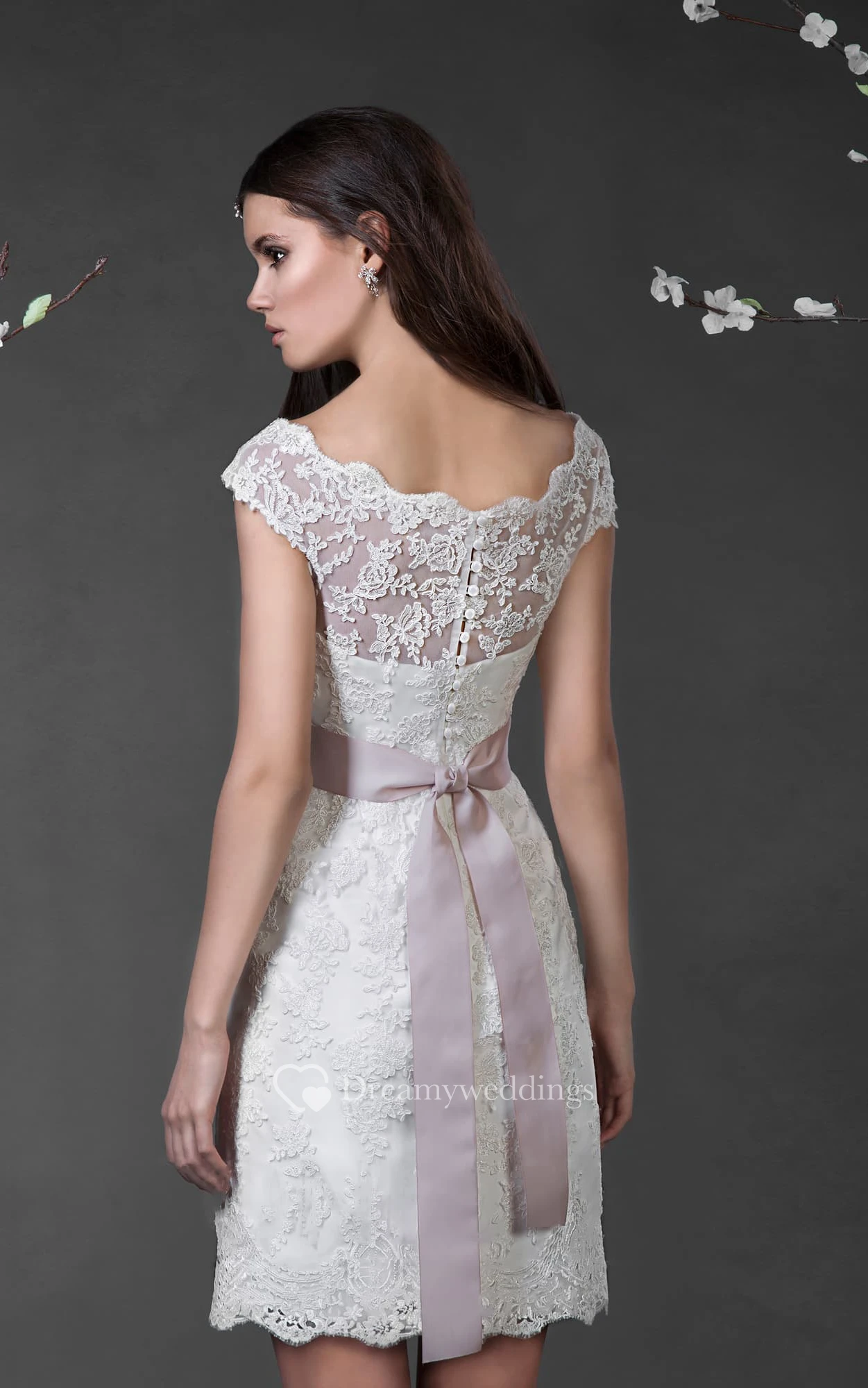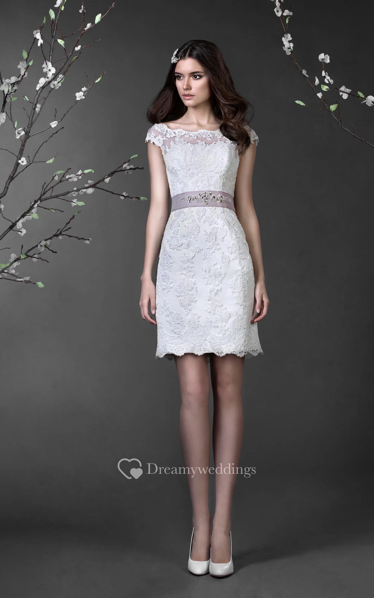 Pencil Mini Bateau Cap-Sleeve Illusion Lace Dress With Appliques And Waist Jewellery