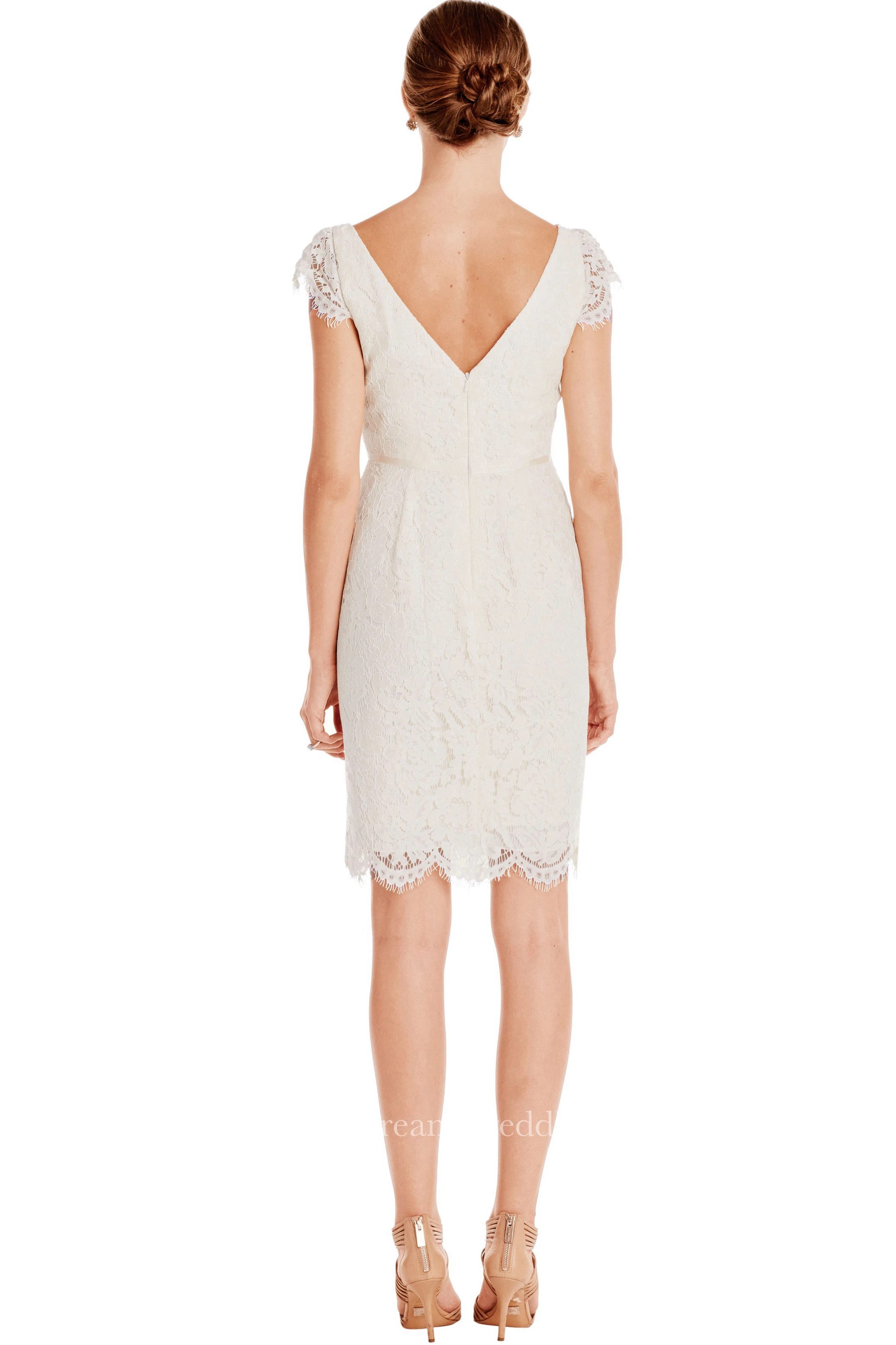 Pencil Mini Cap-Sleeve V-Neck Lace Little White Dress With Low-V Back