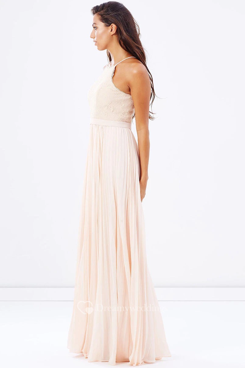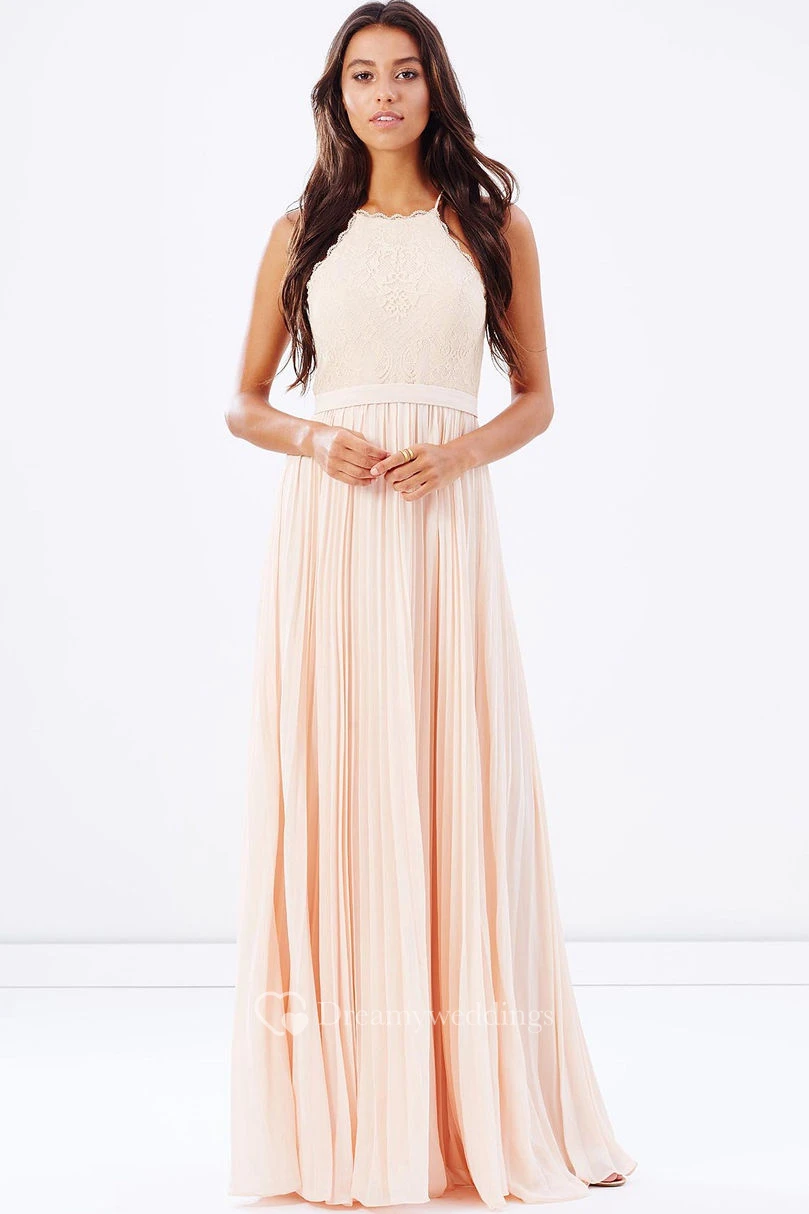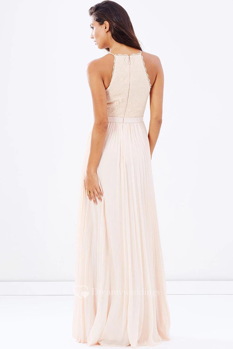 Pleated Sleeveless Spaghetti Chiffon Bridesmaid Dress With Lace And Ribbon
