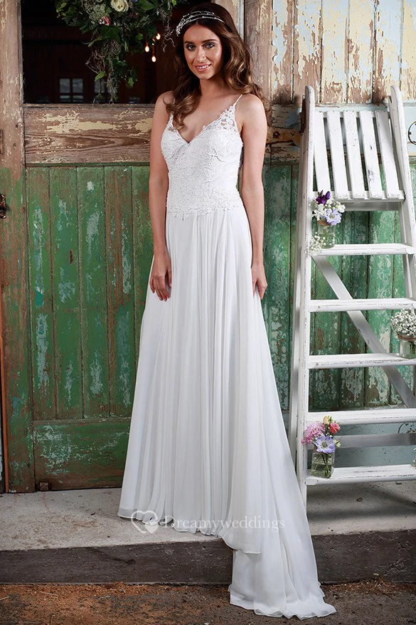 Pleated Spaghetti Long Chiffon Wedding Dress With Appliques And Illusion