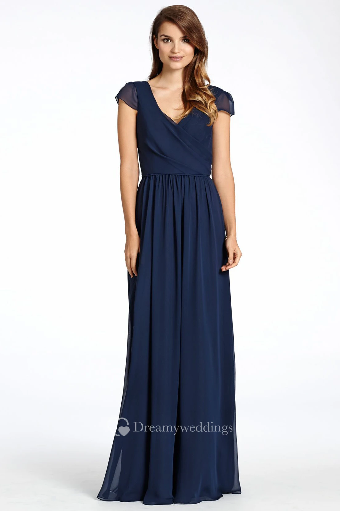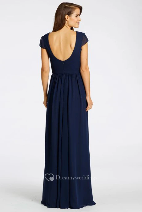 Pleated V-Neck Floor-Length Cap-Sleeve Chiffon Bridesmaid Dress With Low-V Back