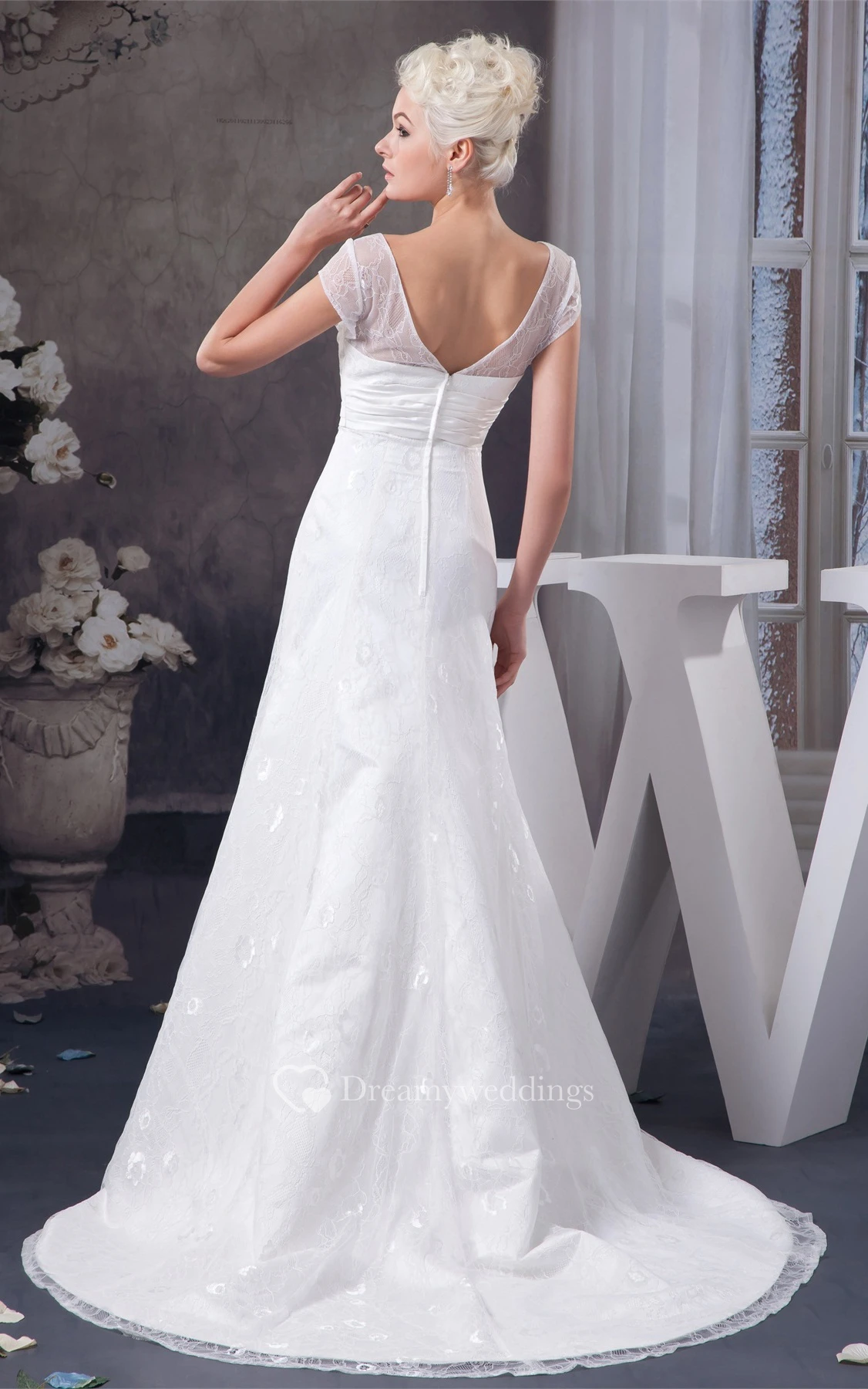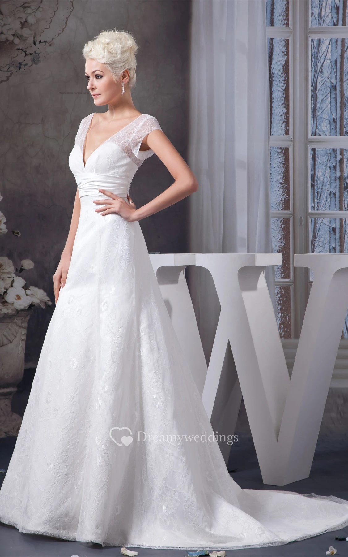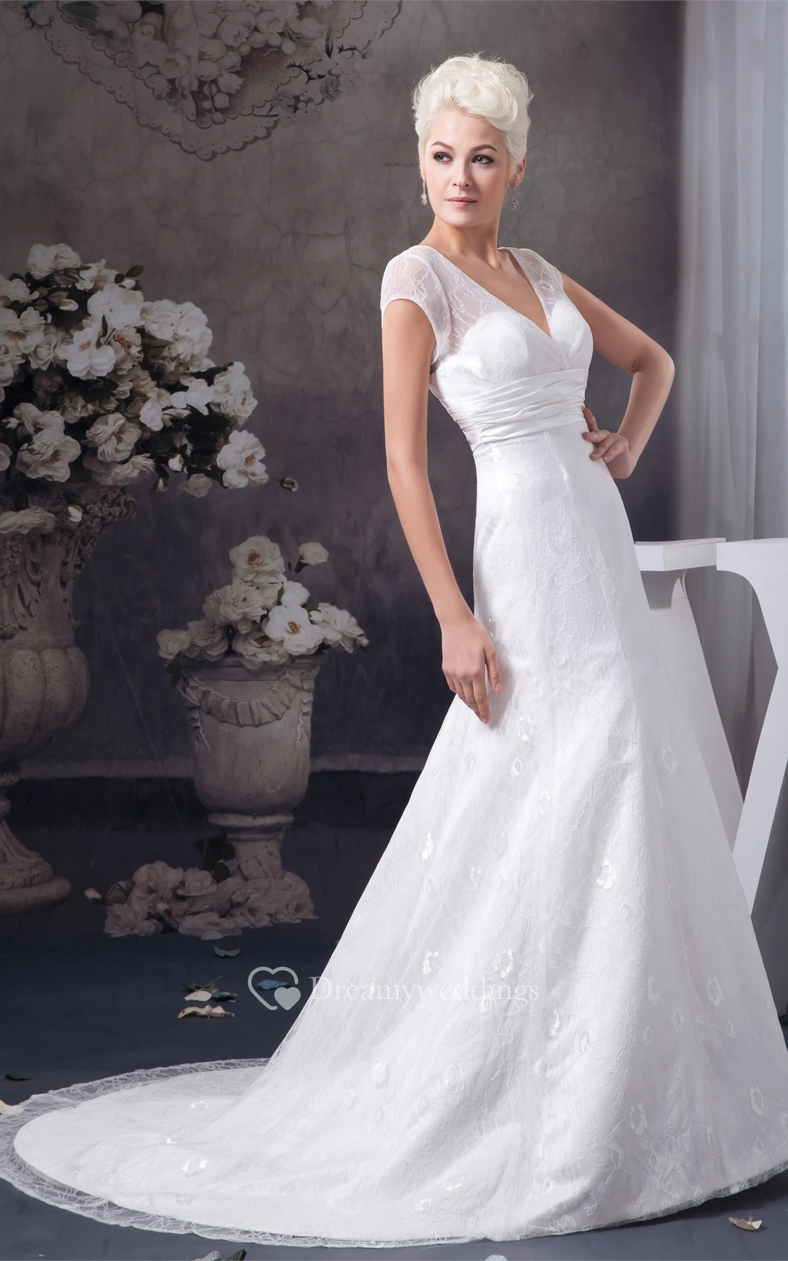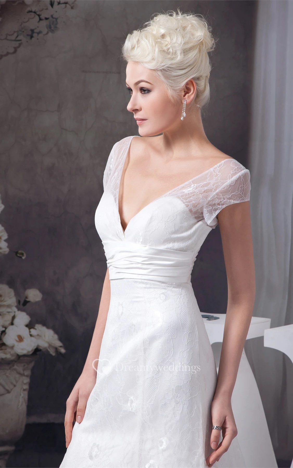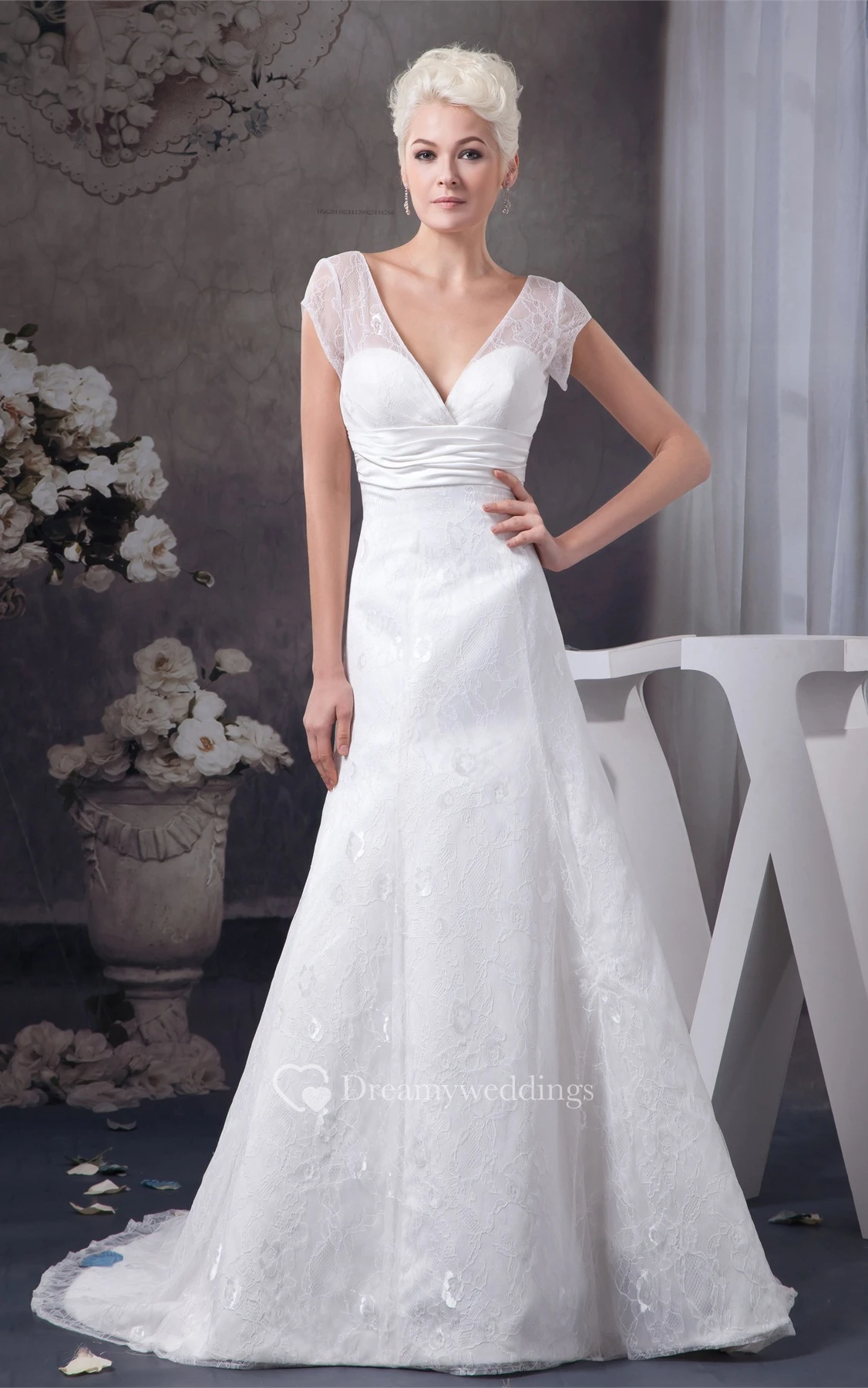Plunged A-Line Caped-Sleeve Ruched Waist and Gown With Lace