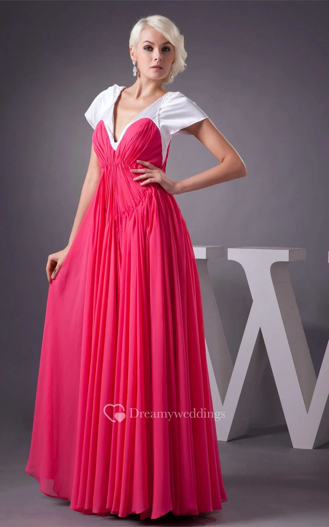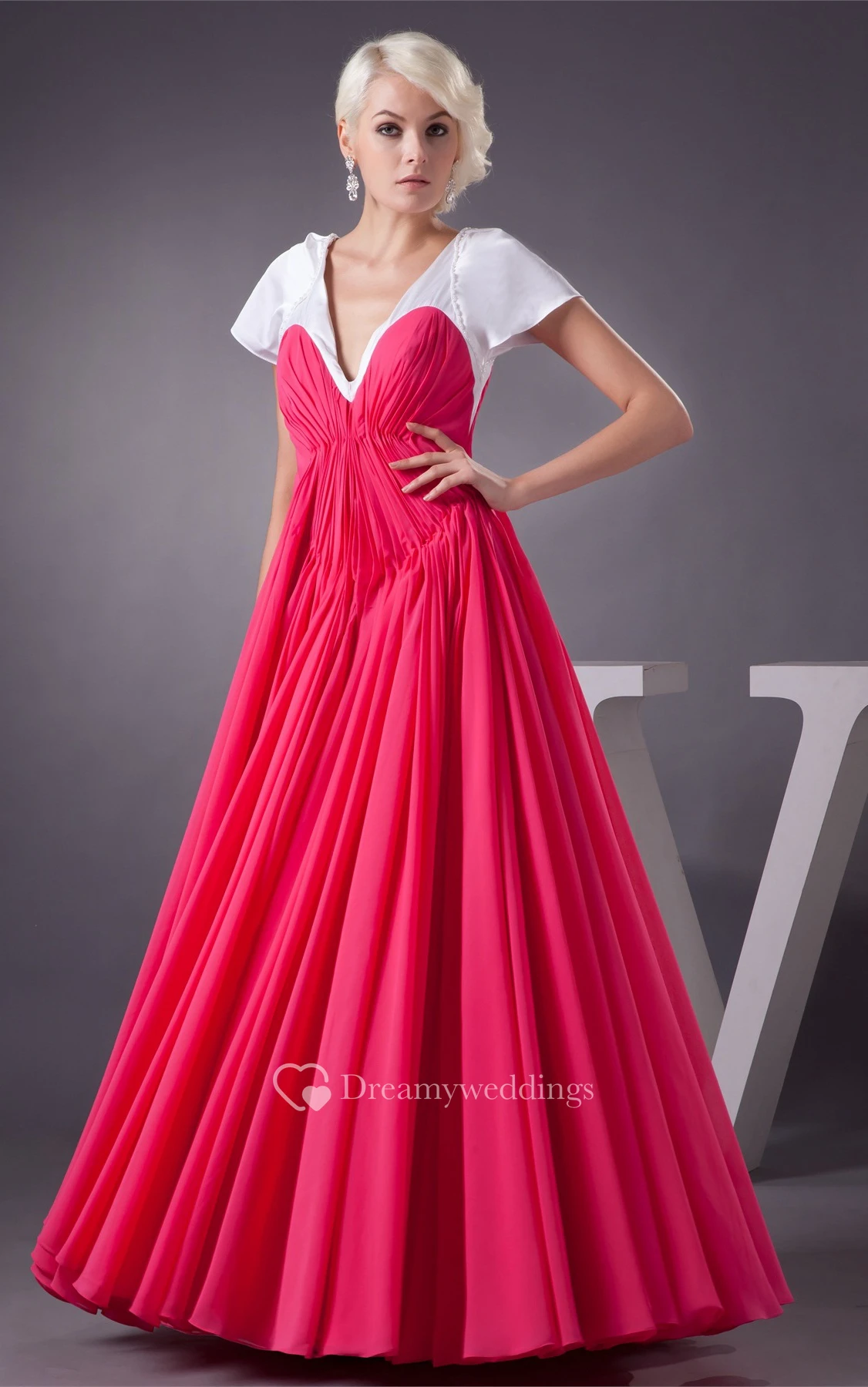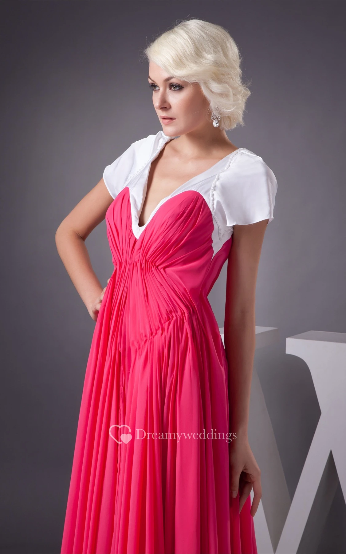 Plunged A-Line Mini-Sleeve Gown With Pleats