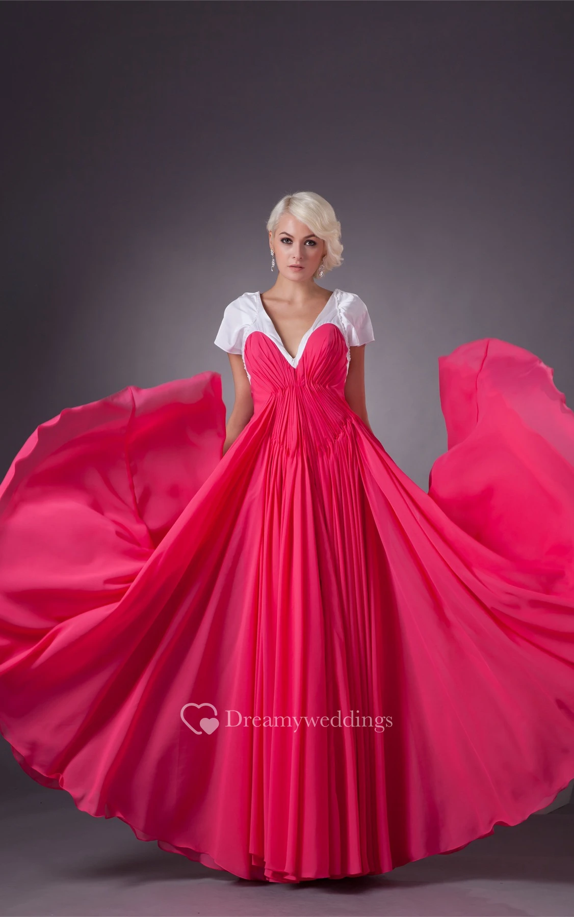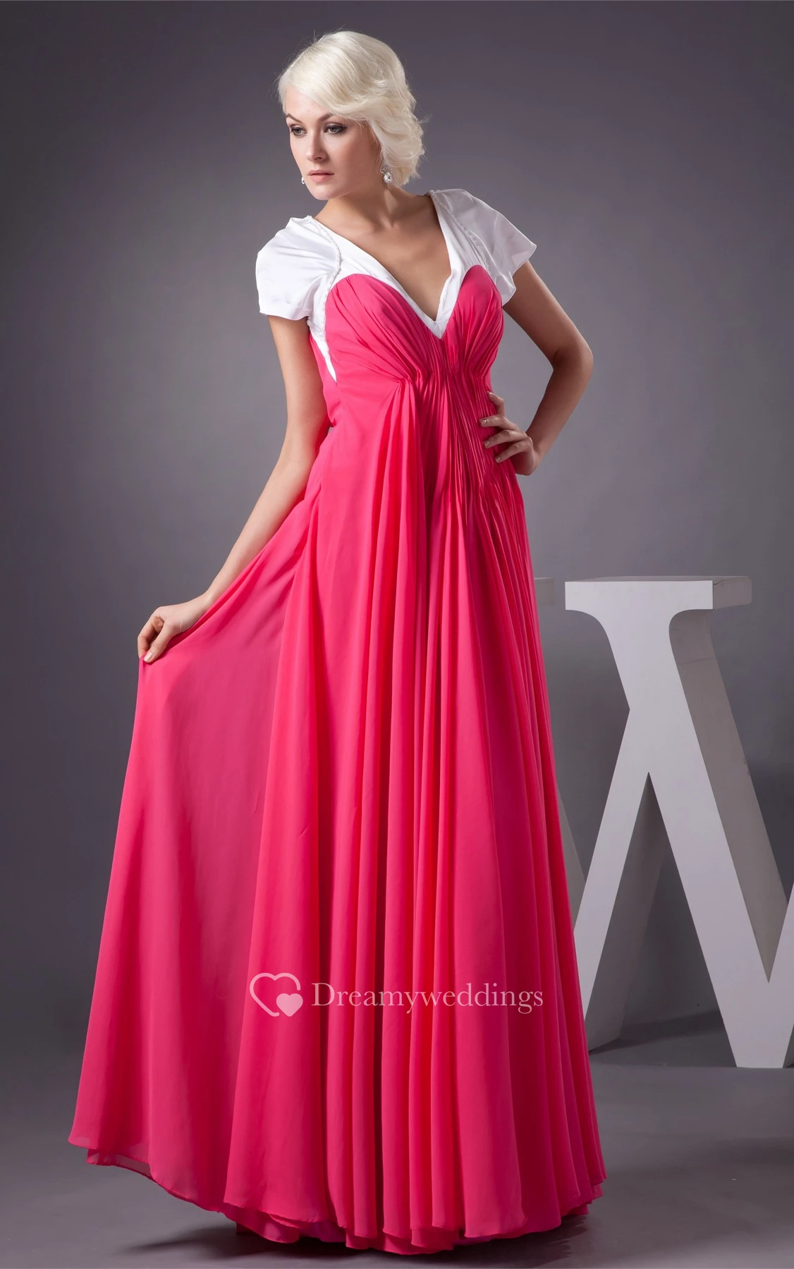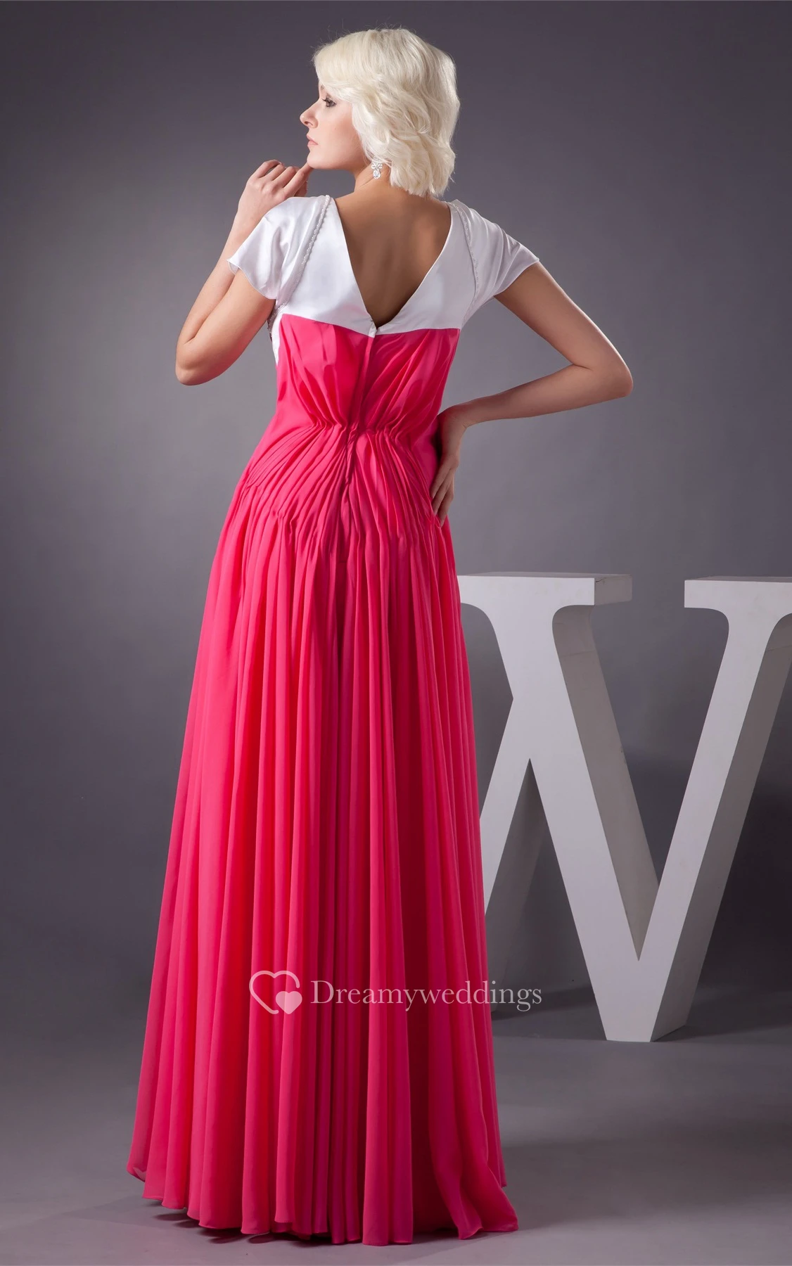 Plunged A-Line Mini-Sleeve Gown With Pleats