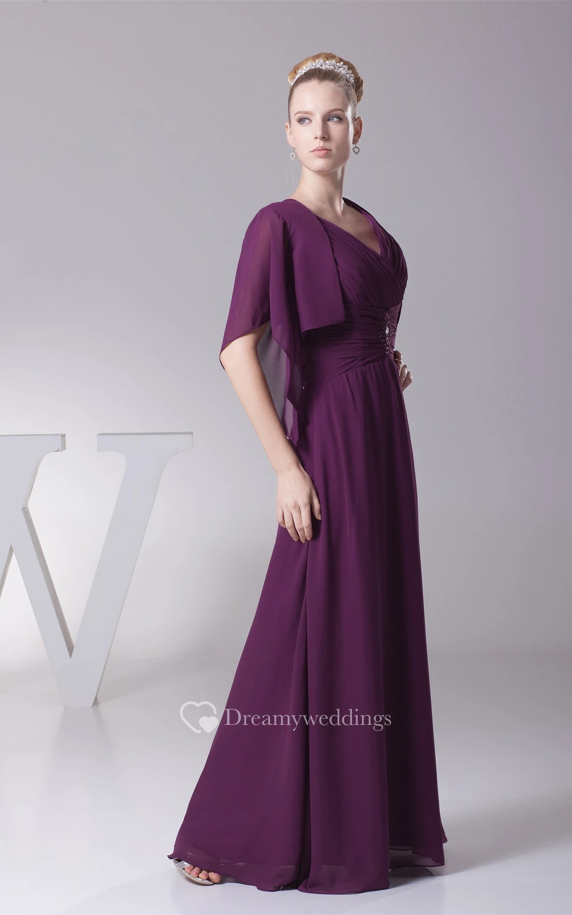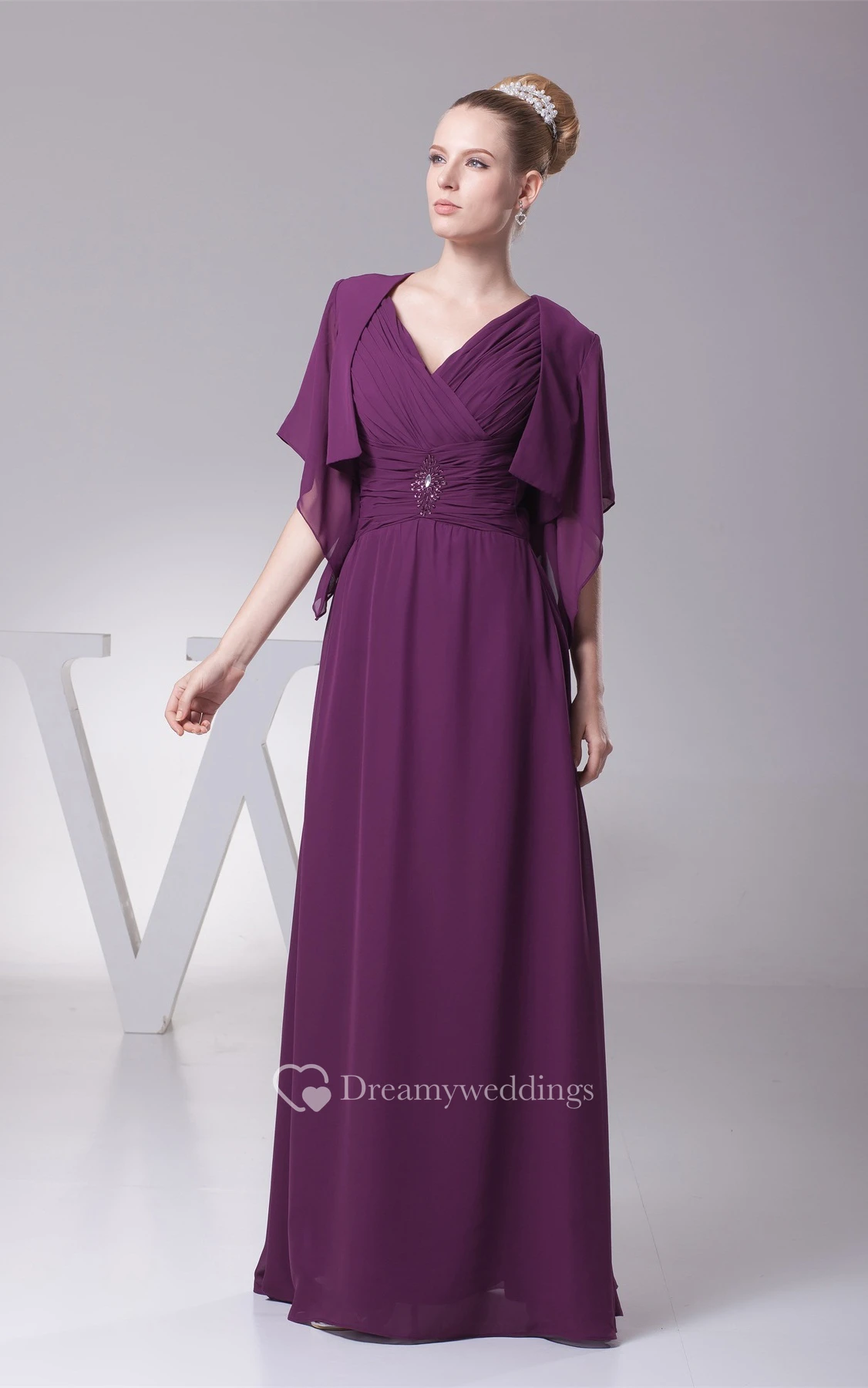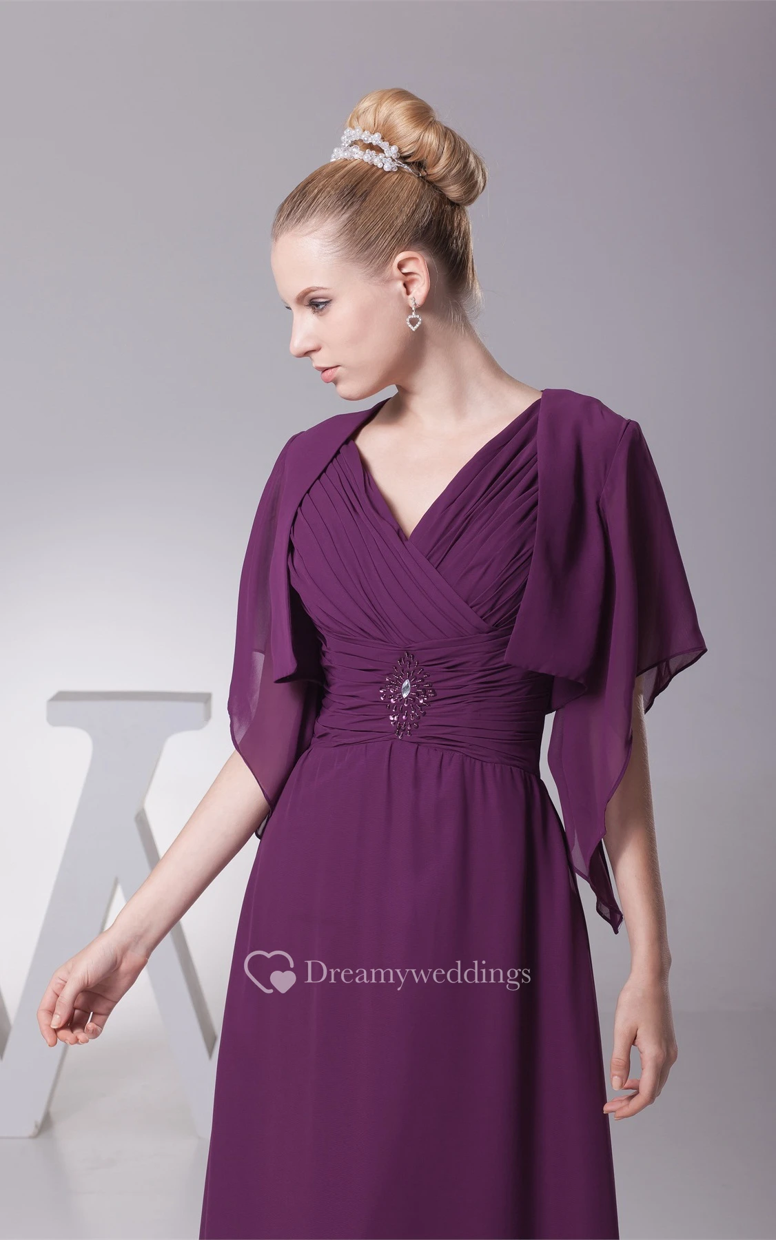Plunged Chiffon Floor-Length Criss-Cross Bolero and Dress With Broach