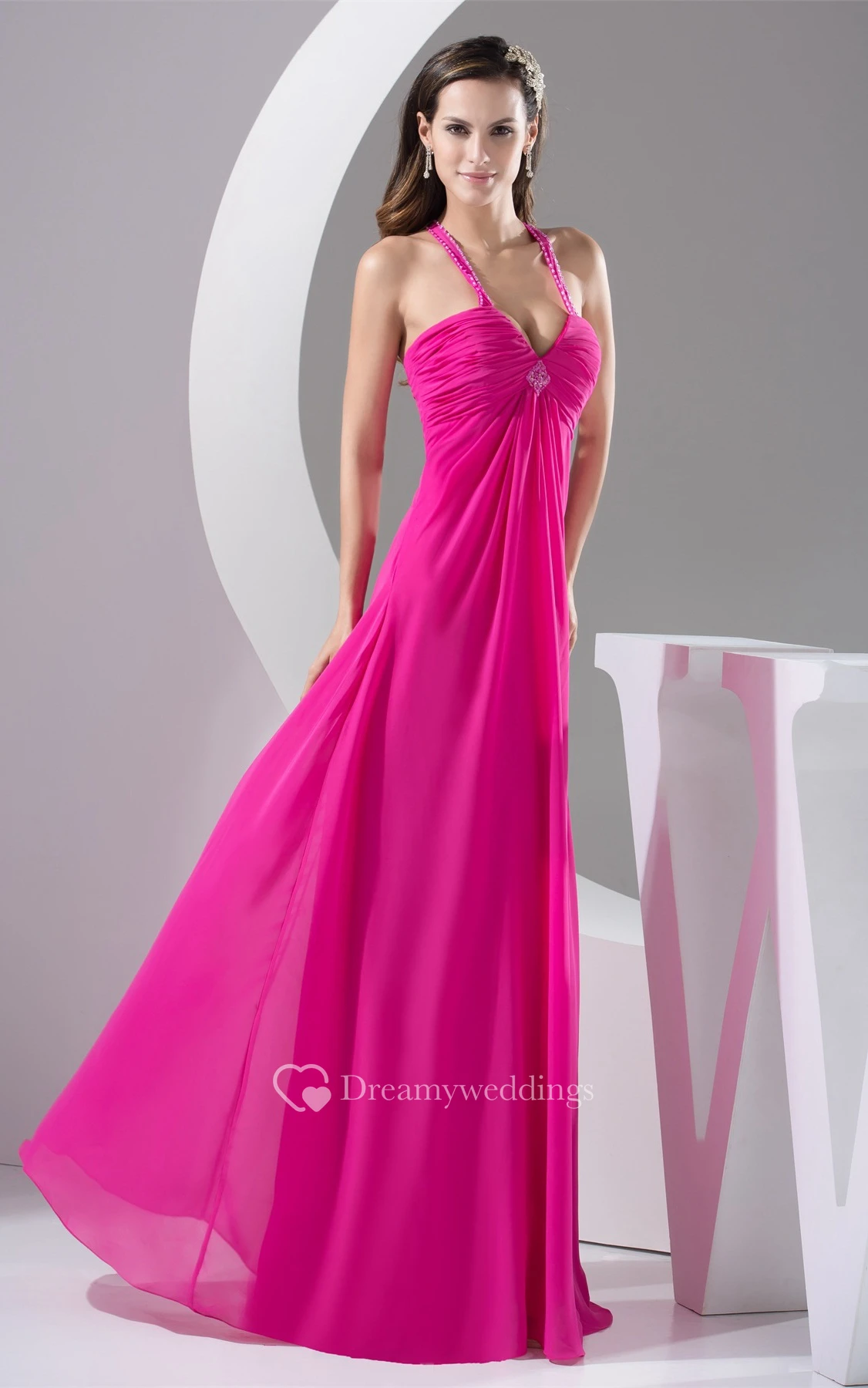 Plunged Chiffon Floor-Length Criss-Cross Broach and Dress With Beading