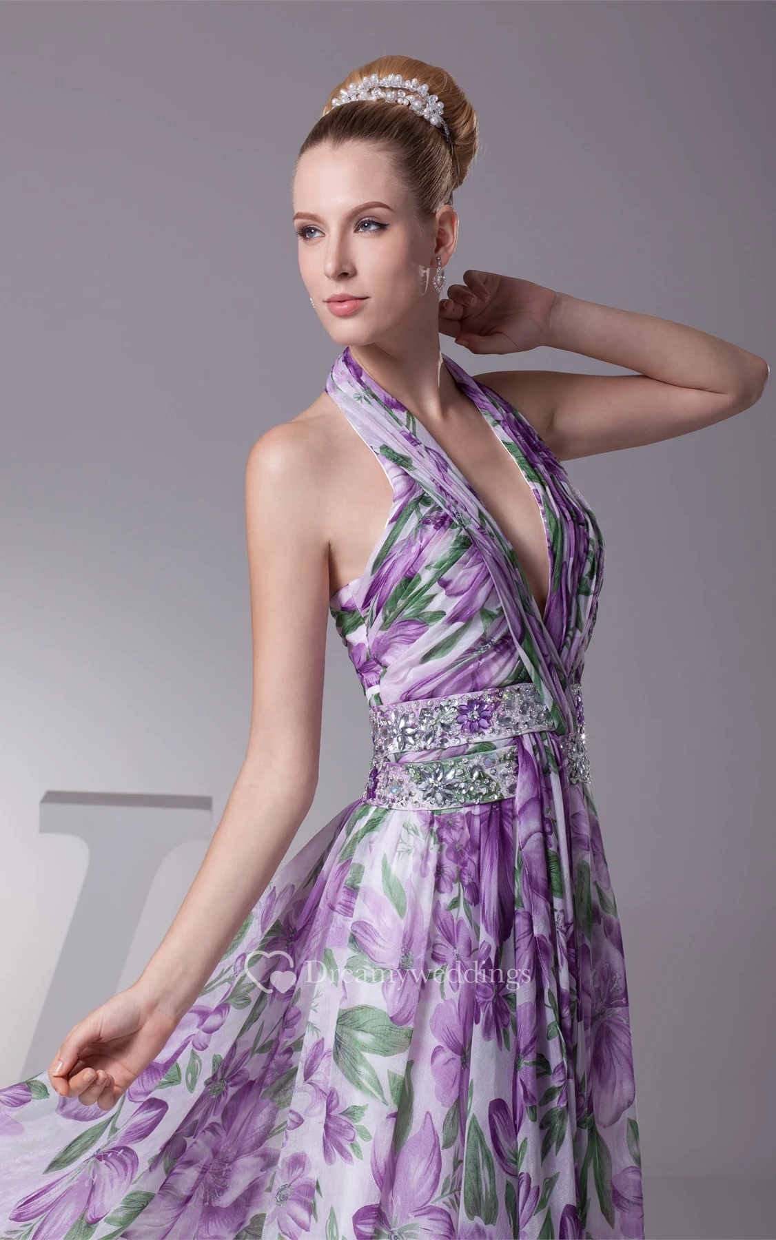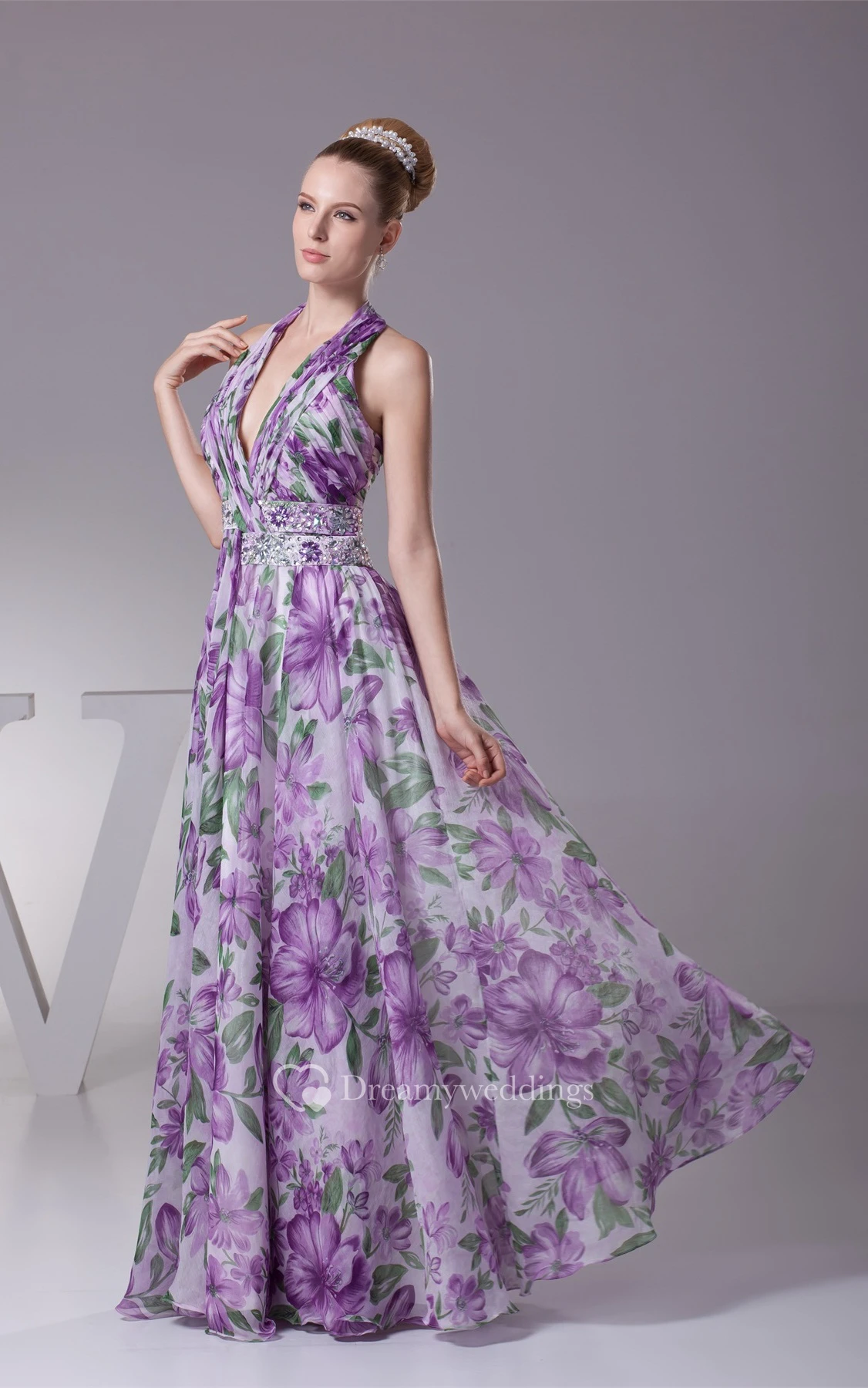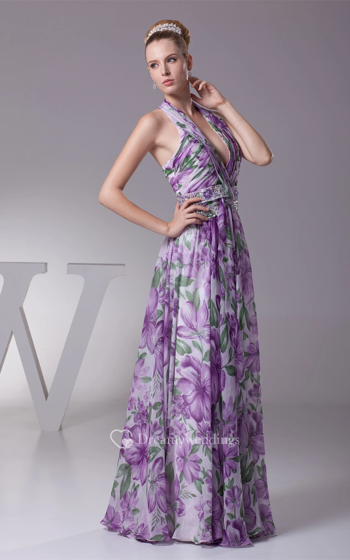 Plunged Floor-Length Pleated Sleeveless Jeweled Waist and Dress With Halter