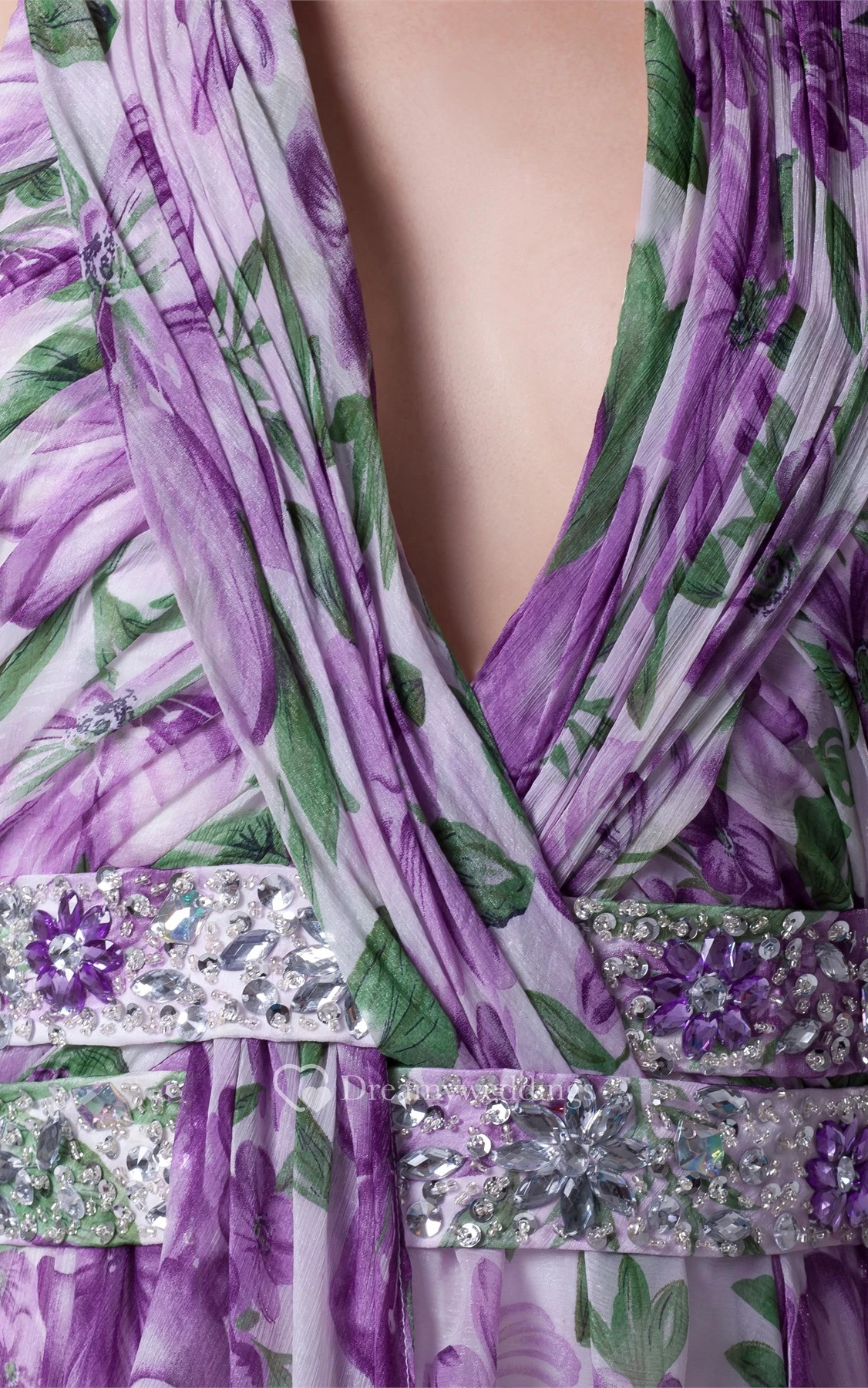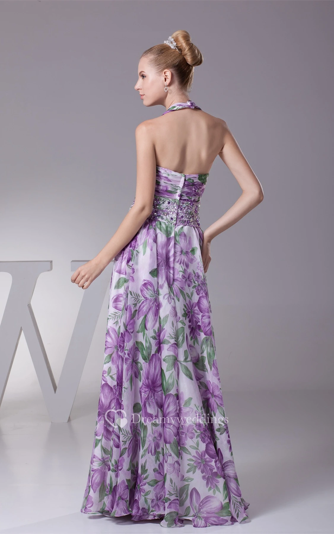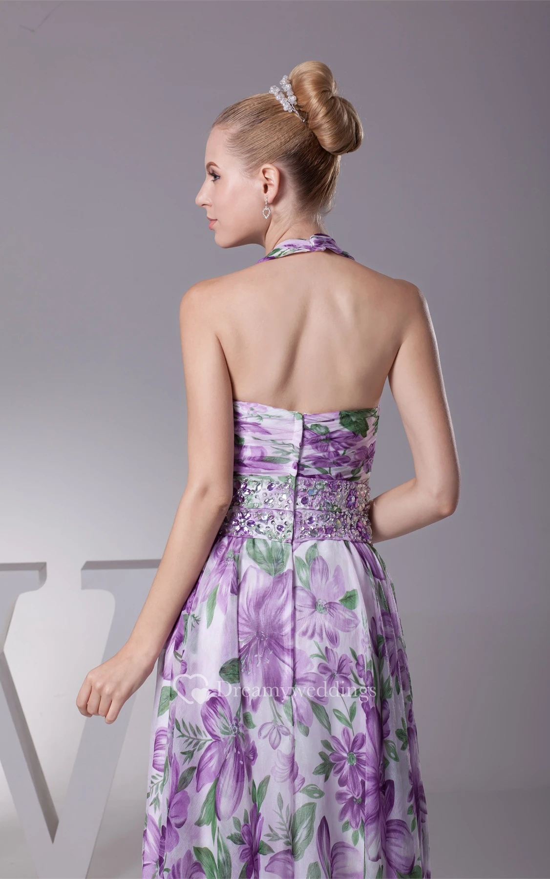 Plunged Floor-Length Pleated Sleeveless Jeweled Waist and Dress With Halter