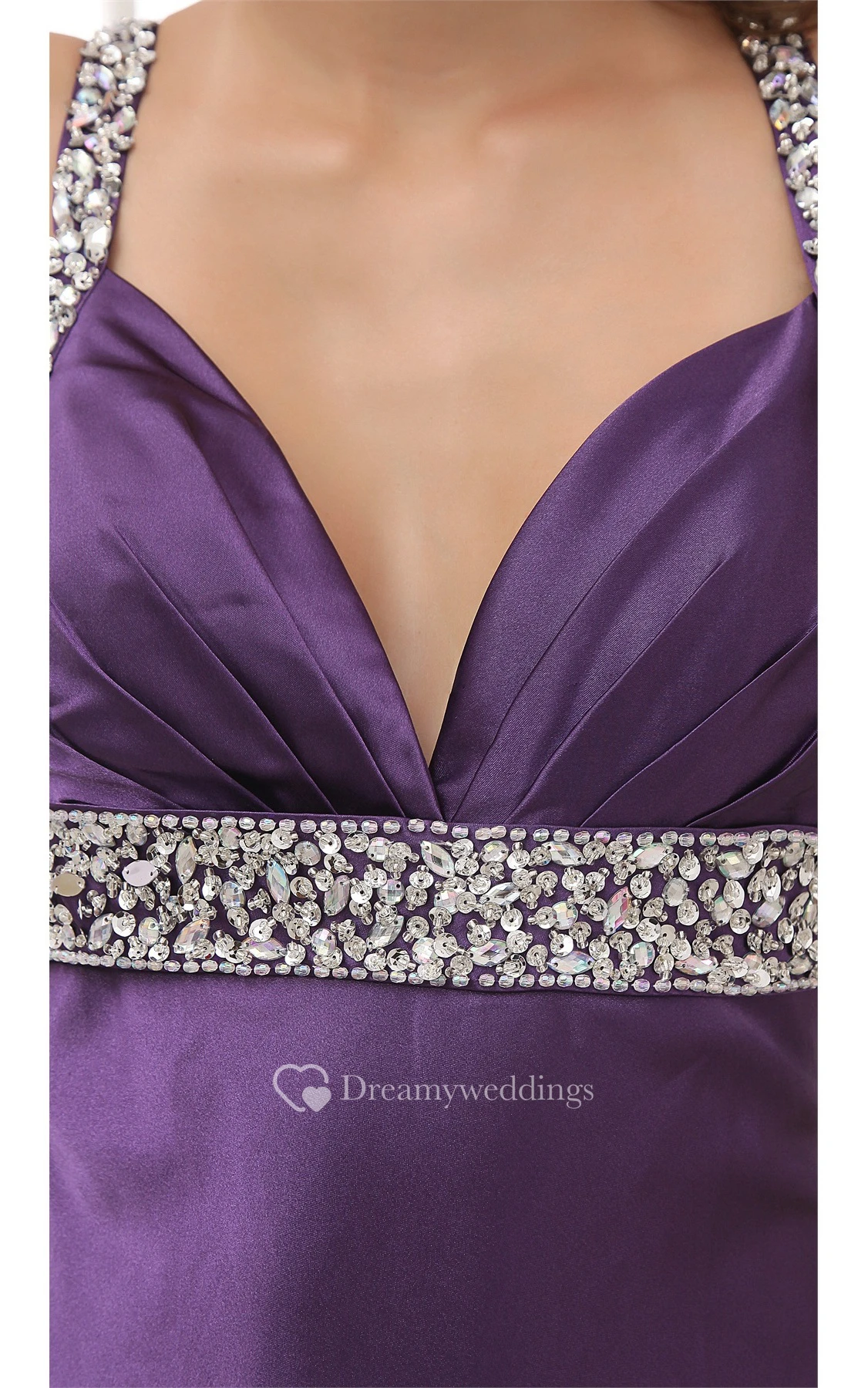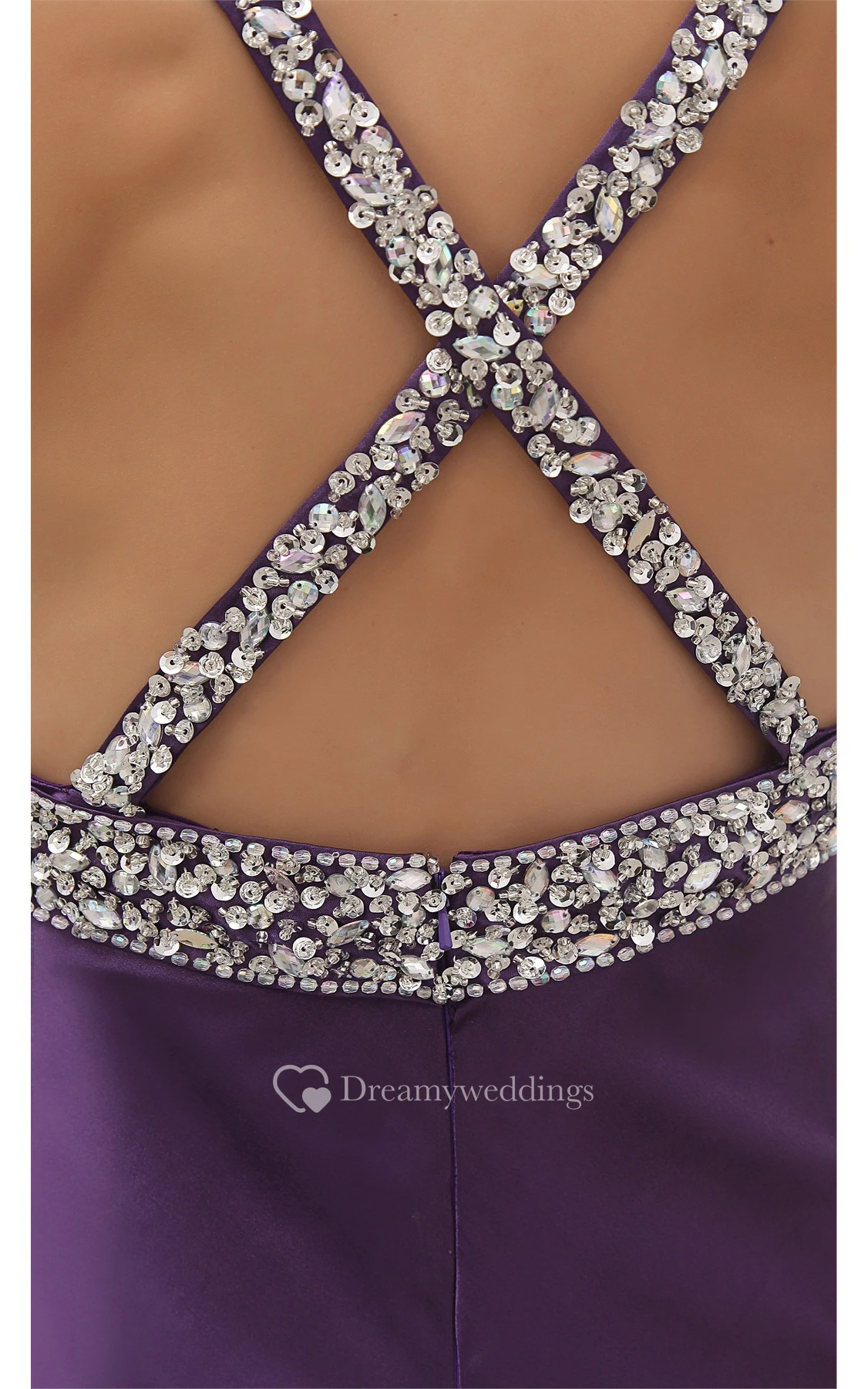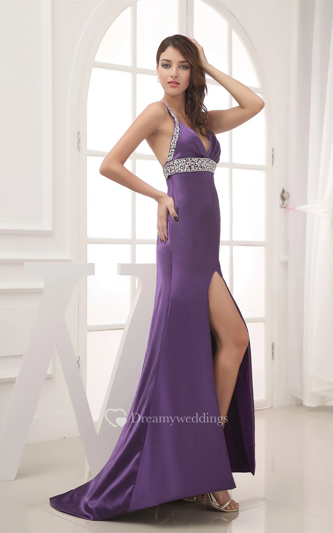 Plunged Satin Front-Split Brush Train and Dress With Gemmed Waist