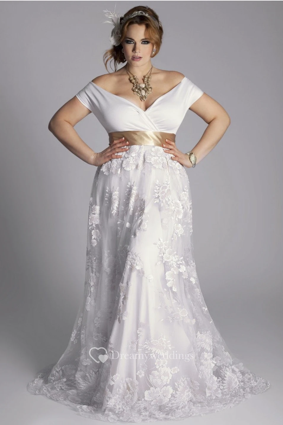 Plus Size Off-Shoulder A-Line Vintage Lace Floor Length Wedding Gown With Sash
