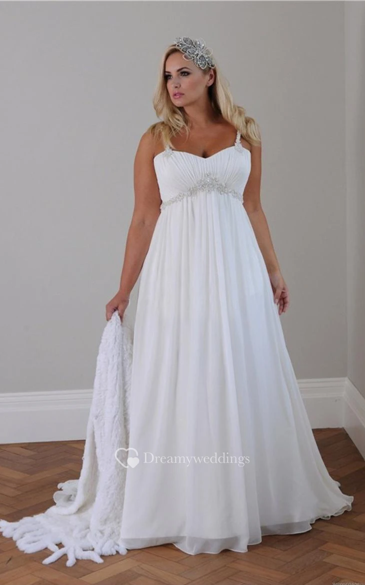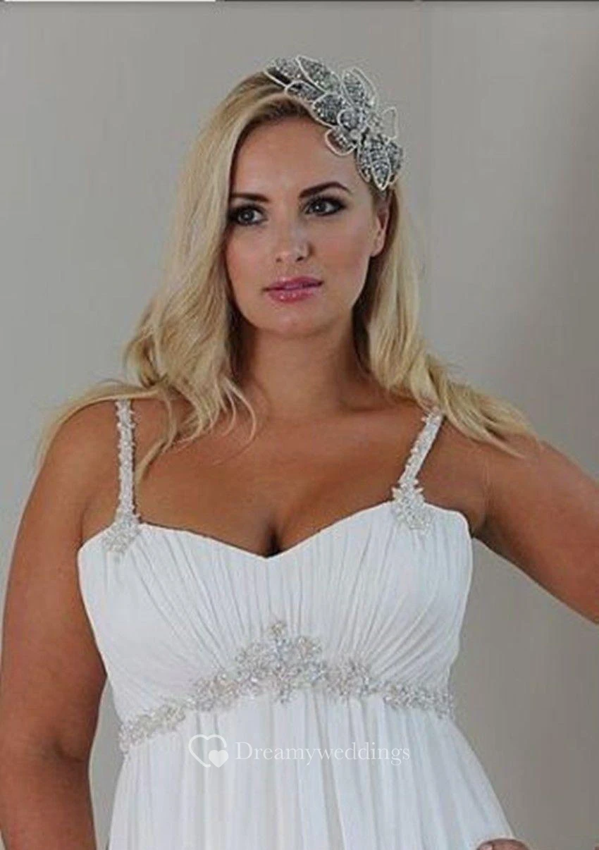 Plus Size Spaghetti Strap Crystal Beaded Chiffon Beach Wedding Gown
