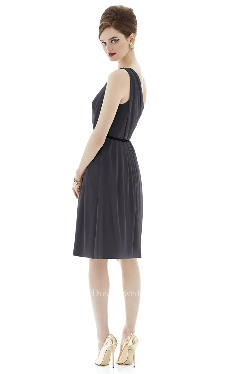 Refined Mini Sleeveless Ruched A-Line Chiffon Dress with One Shoulder and Bow Sash