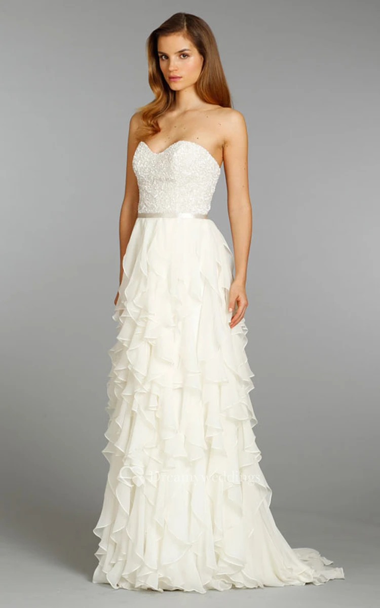 Refined Pearl Beaded Bodice Ruffle Dress With Satin Ribbon