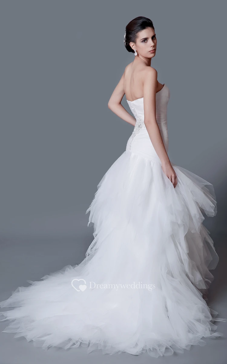 This mermaid wedding gown is perfect for the bride who wants to make an impact with her dress. Ruched tulle runs around the strapless bodice, which is formfitting and has a sweetheart neckline. The trumpet skirt is made of many draped layers of tulle, creating a wide skirt with a court train. A lovely beaded design on the bodice adds a dramatic detail.