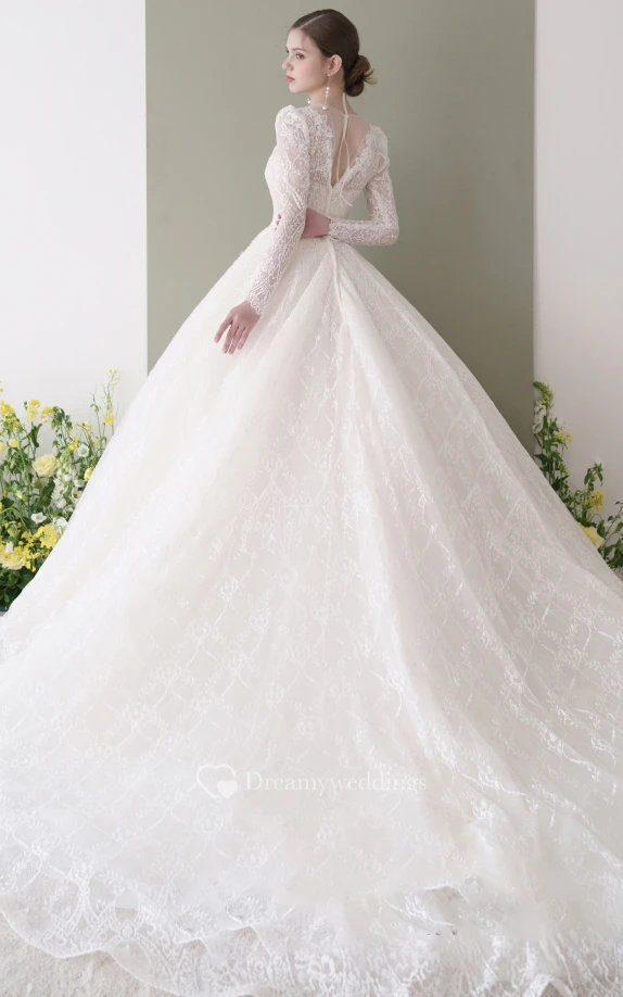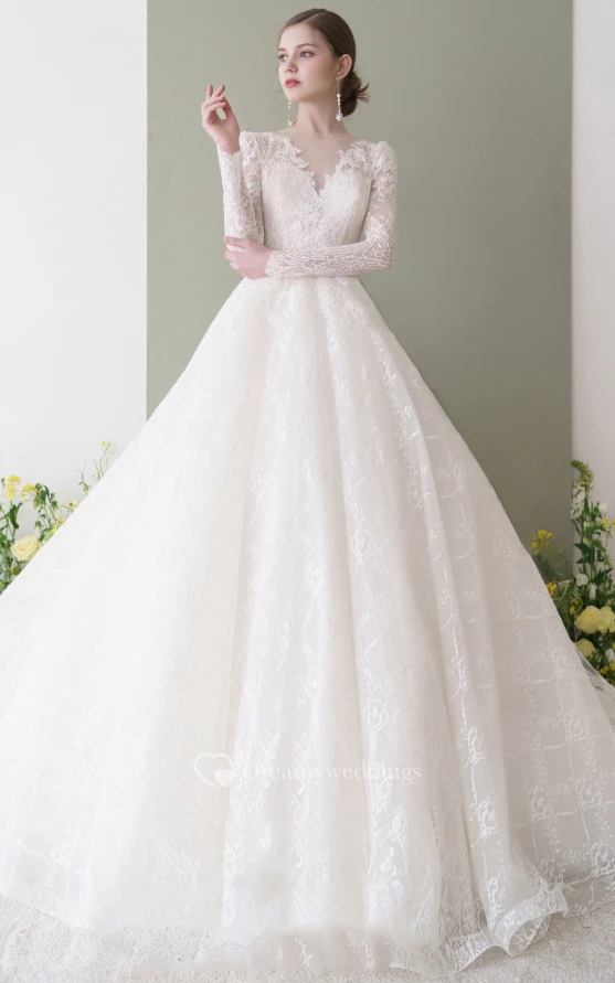 Romantic Ball Gown Lace Floor-length Long Sleeve Keyhole Wedding Dress with Appliques