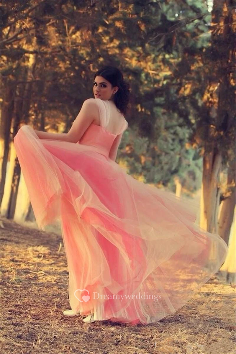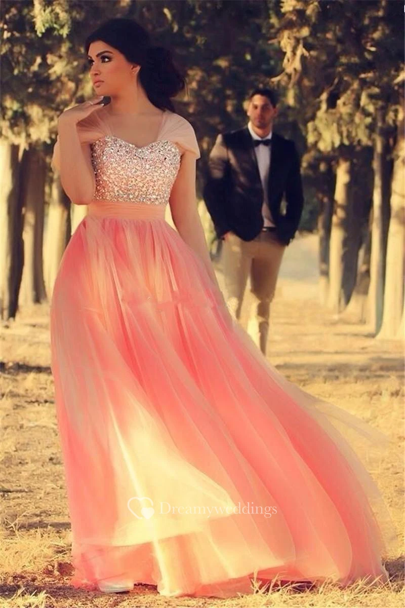 Romantic Cap Sleeve Tulle Pink Evening Dress Crystals Floor-length