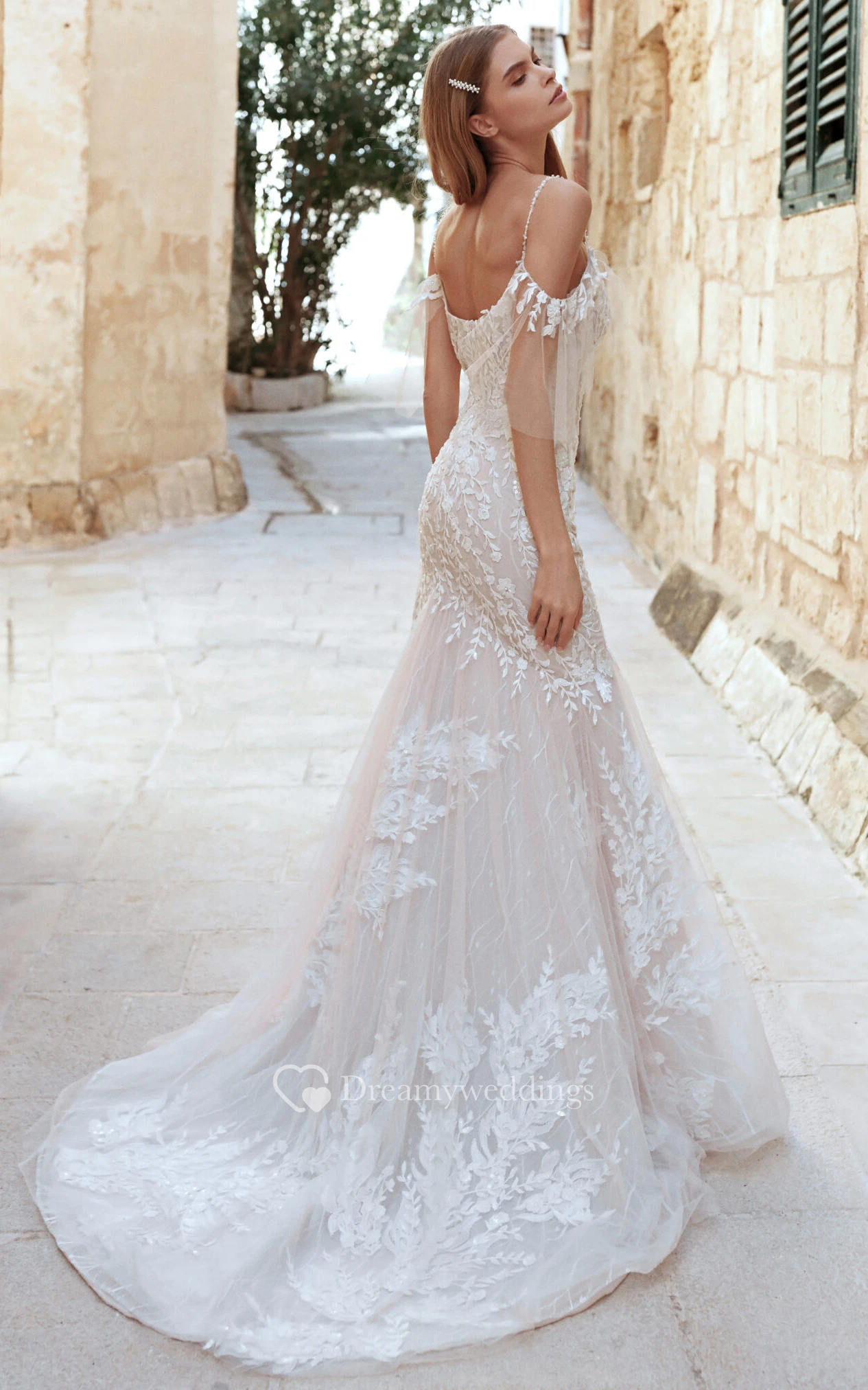 Romantic Lace Floor-length Short Sleeve Mermaid Open Back Wedding Dress with Appliques
