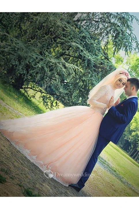 Romantic Long Sleeve Tulle Lace Arabian Wedding Dress Sweep Train
