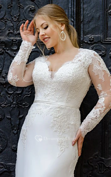 Romantic Satin A Line Floor-length Train Long Sleeve Wedding Dress with Appliques
